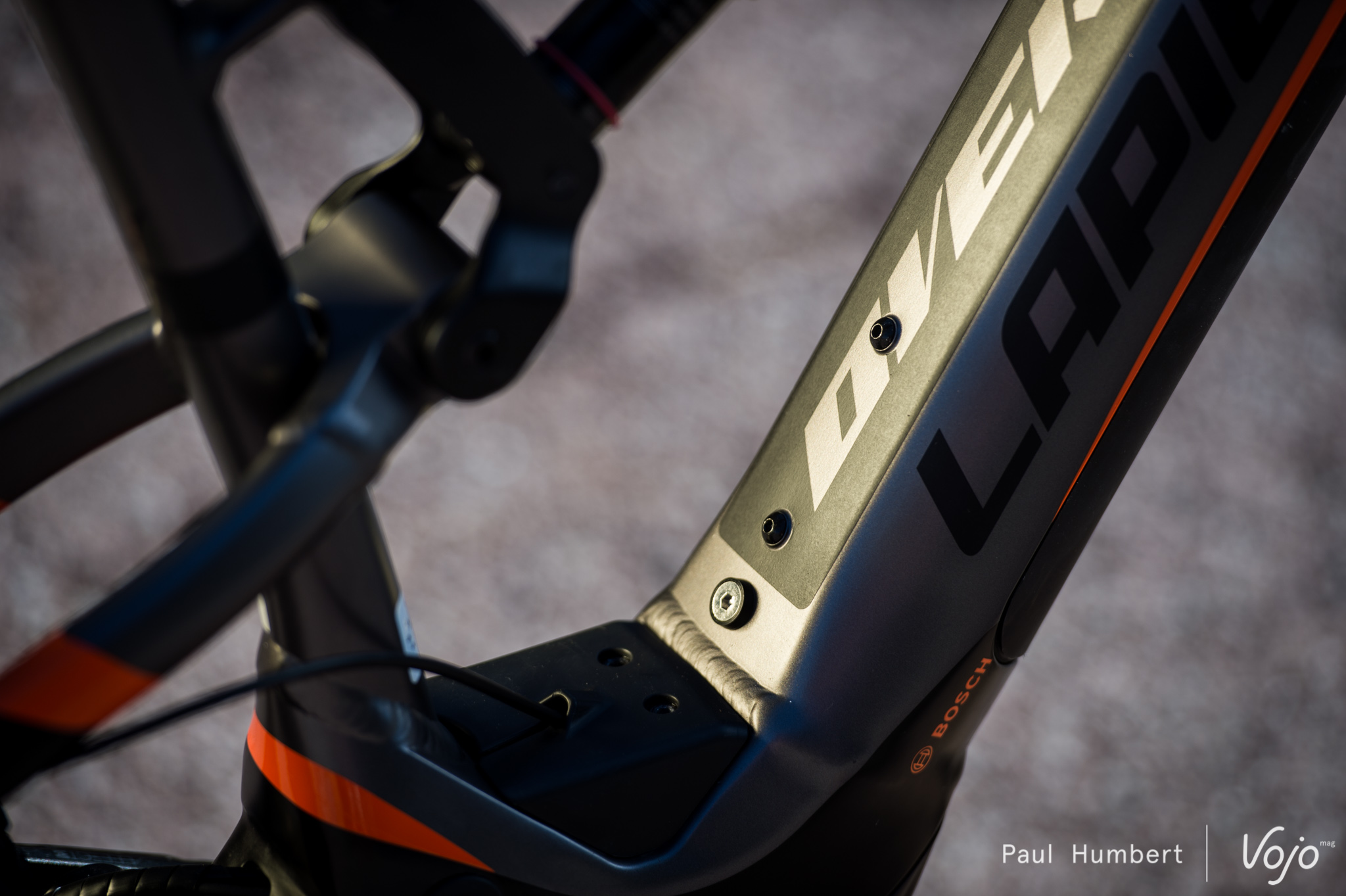 Lapierre annonce une réduction de 20% de la taille du tube inférieur grâce à cette batterie. Cette dernière est toutefois plus longue qu’une batterie « traditionnelle ».