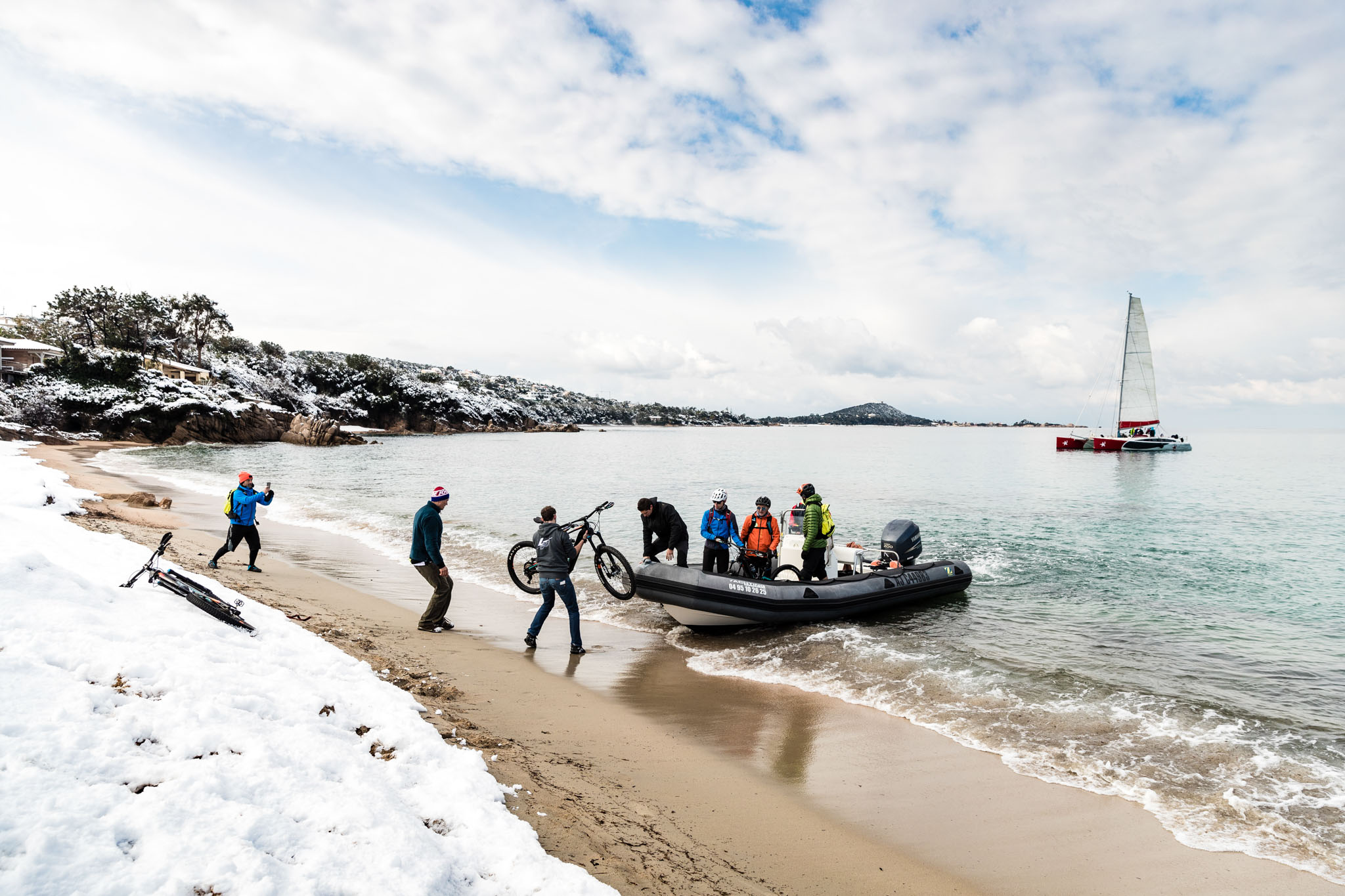 Après une mésaventure et quelques portages au sommet d’une montagne enneigée, nous descendons vers la plage par des sentiers moins humides. Les roches sont nombreuses et le vélo électrique s’impose comme la machine idéale pour évoluer dans cette partie de la corse.