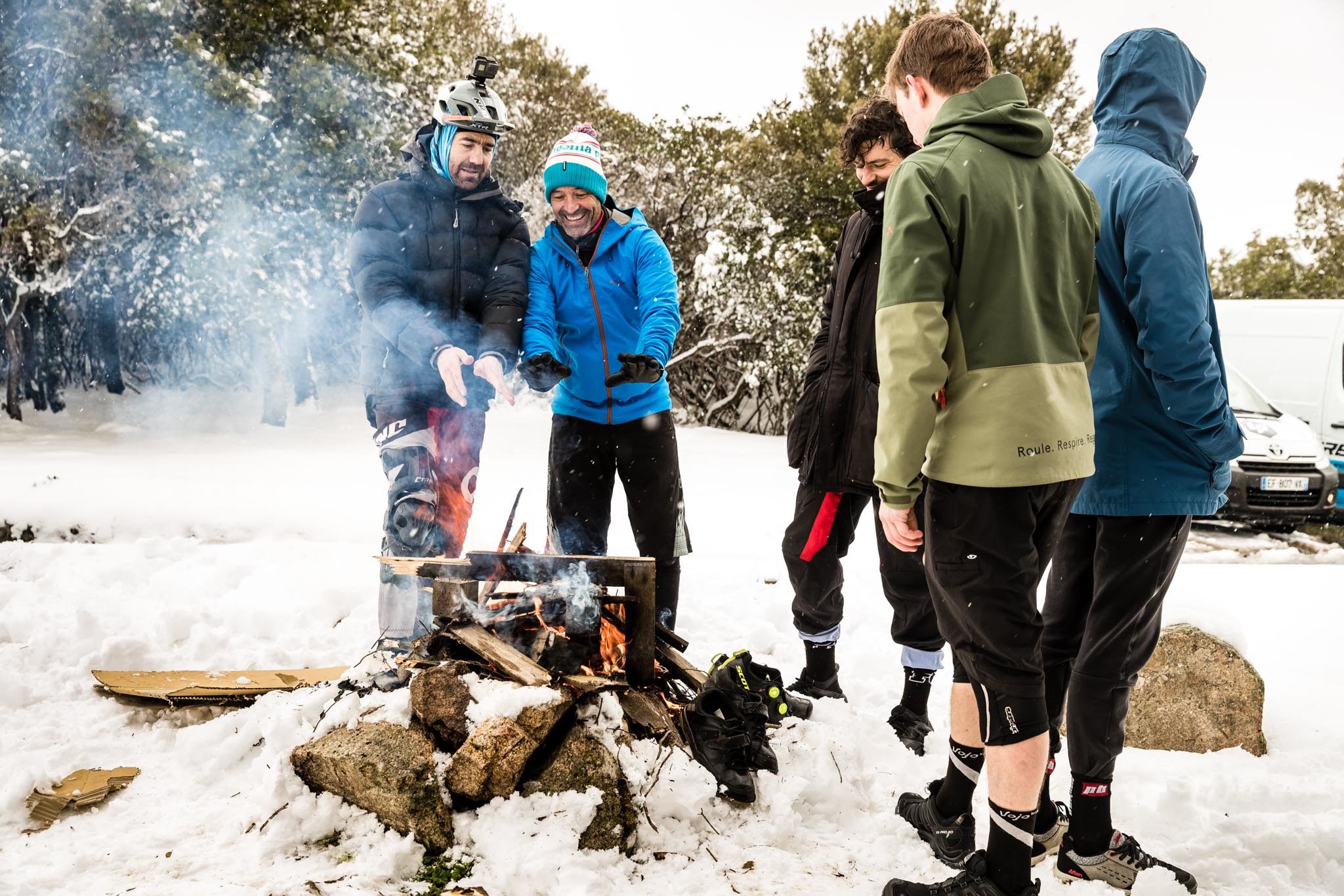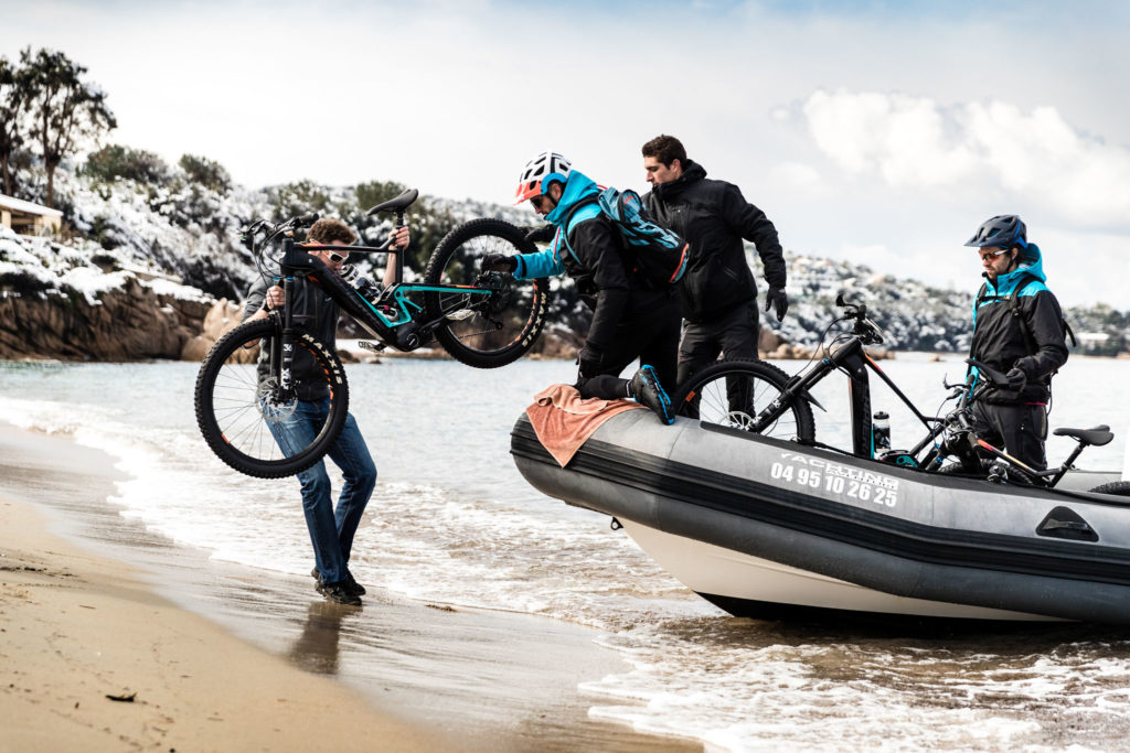 Après une mésaventure et quelques portages au sommet d’une montagne enneigée, nous descendons vers la plage par des sentiers moins humides. Les roches sont nombreuses et le vélo électrique s’impose comme la machine idéale pour évoluer dans cette partie de la corse.