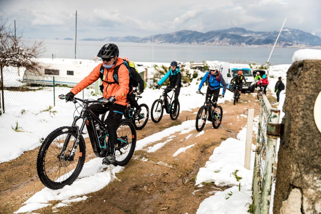 Le cadre de l’Overvolt 727i Shimano disséqué, il ne nous restait plus qu’à l’enfourcher pour quelques glissades dans la neige avant de découvrir les sentiers de Porto Pollo.