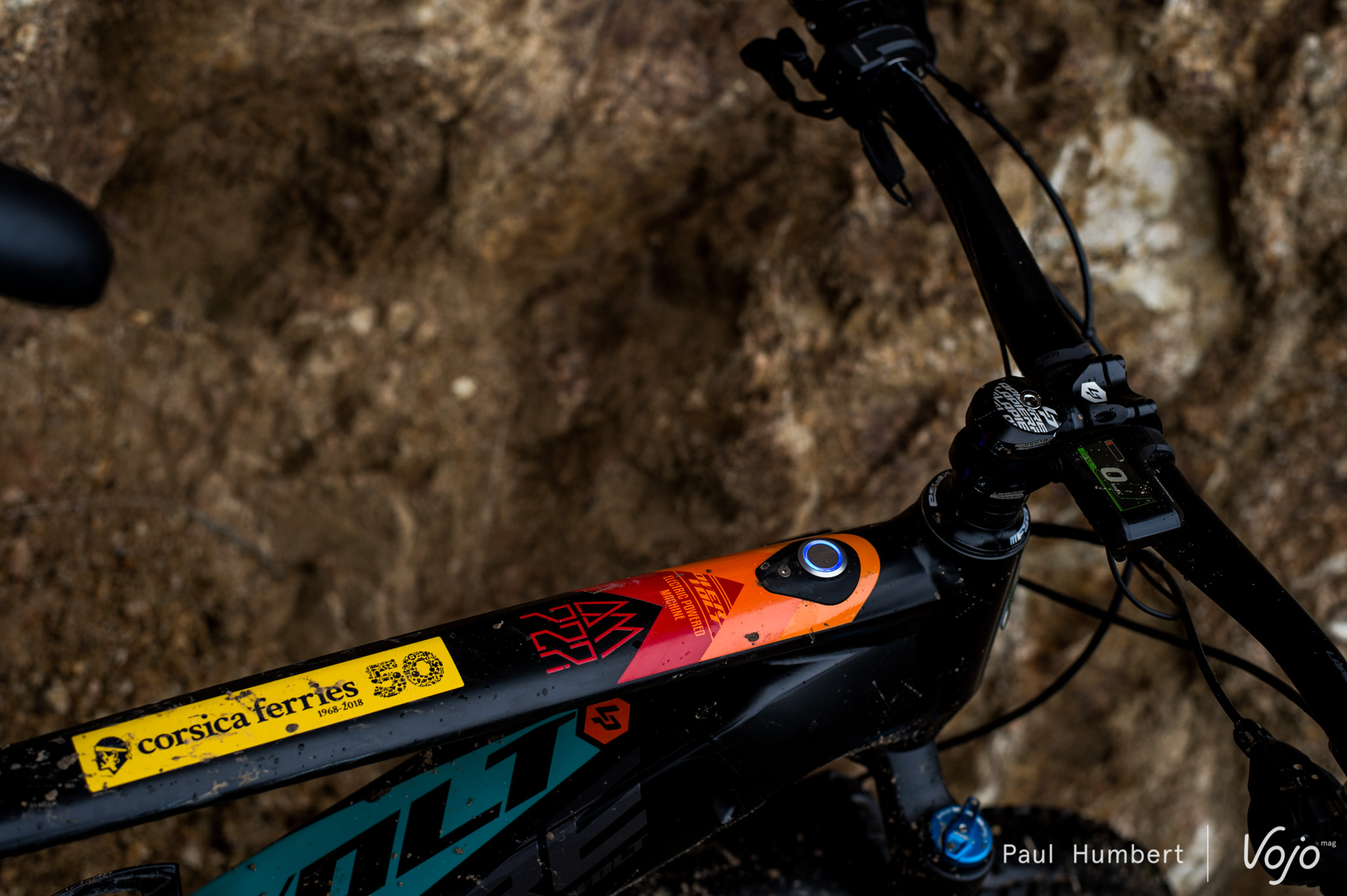 Une fois la baie d’Ajaccio traversée, on grimpe sur le vélo. Plutôt court pour un taille L, il reste dans des proportions intéressantes et s’avèrera bien équilibré sur les sentiers une fois en action. Il affiche un reach de 459mm, un angle de direction de 65,5 et des bases de 445mm.