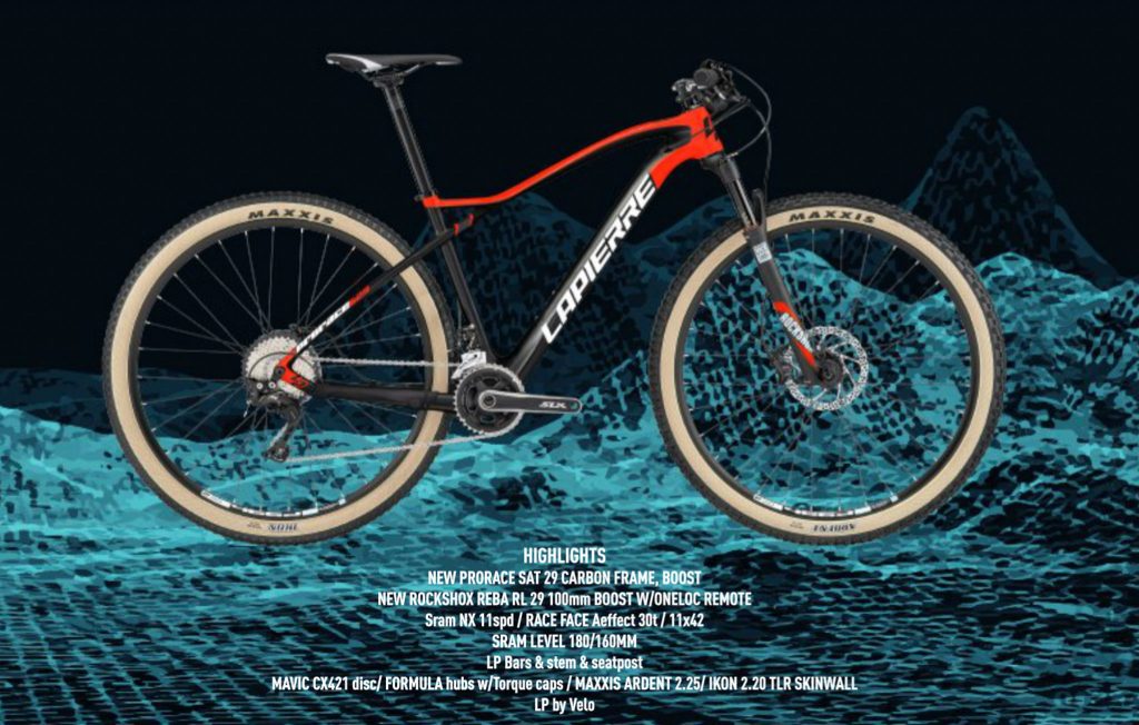 C’est l’entrée de gamme de la nouvelle famille Lapierre Prorace. Il est équipé d’une nouvelle Rockshox Reba RL et d’une transmission 11 vitesses Sram NX couplée à un pédalier RaceFace Aeffect ainsi qu’un plateau de 30 dents. Les freins Sram Level équipent la machine.