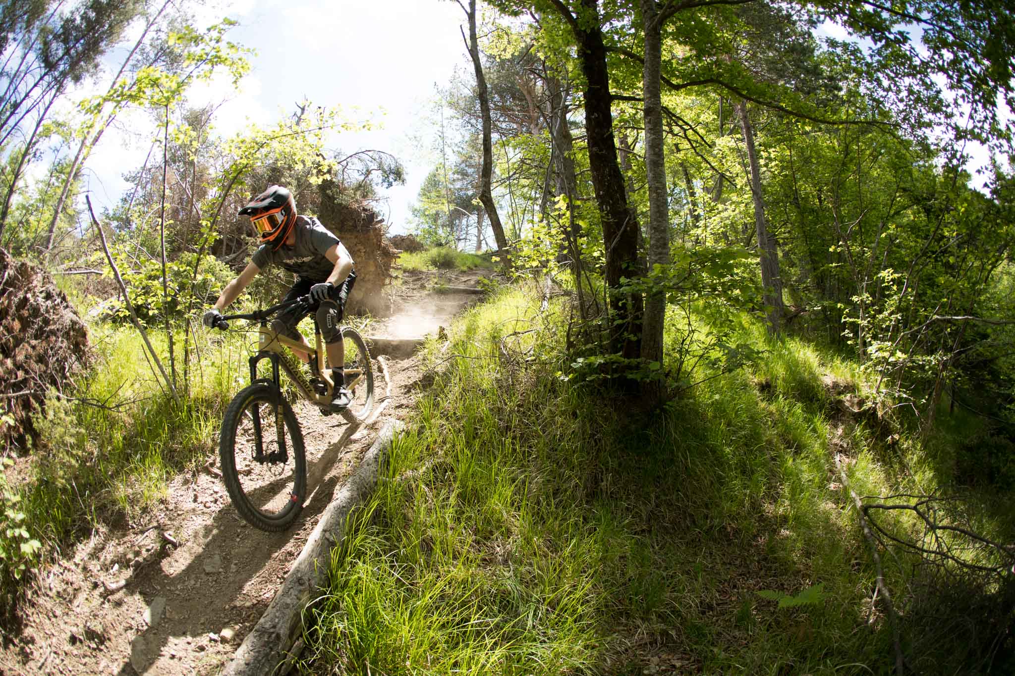 Lancé sur les sentiers, Cédric Gracia aux fesses, on prend conscience que le changement de cinématique modifie totalement le vélo. C’est une arme en descente ! Pourtant, nous qui n’avons pas forcément l’habitude des vélos de descente, on s’y sent bien. Le cintre est très large (800mm), les pneus aussi (Maxxis Wide Trail, un très bon choix) mais nous ne sommes pas déroutés par ce qui pourrait être un « panzer ».