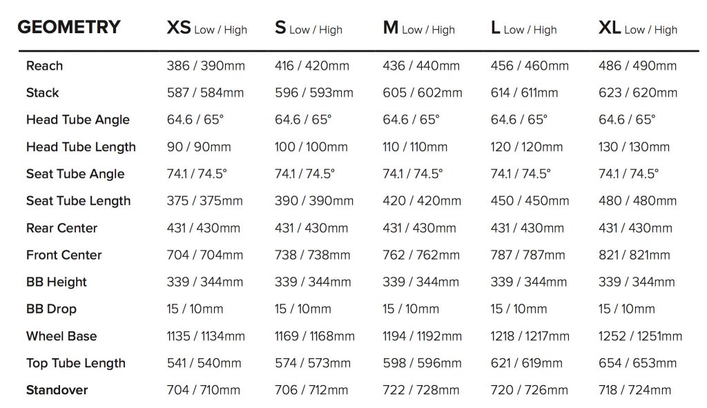Le reach en taille M est de 440mm en position haute et 435mm en position basse. Le boitier de pédalier perd lui aussi 5mm (339 ou 344mm). L’angle de direction passe de 64,5 à 65 degrés avec une Rockshox Lyrik de 170mm. Au total, dans sa position la plus longue, le Nomad a un empattement de 1194mm (toujours en taille M), soit un peu plus de 2cm que l’ancienne version.