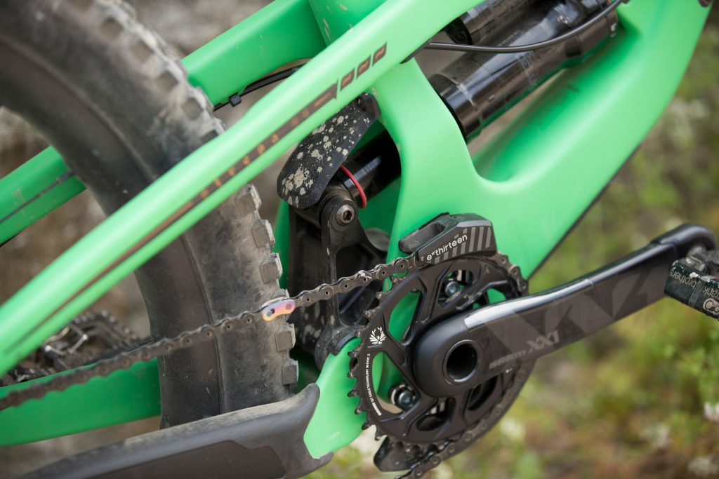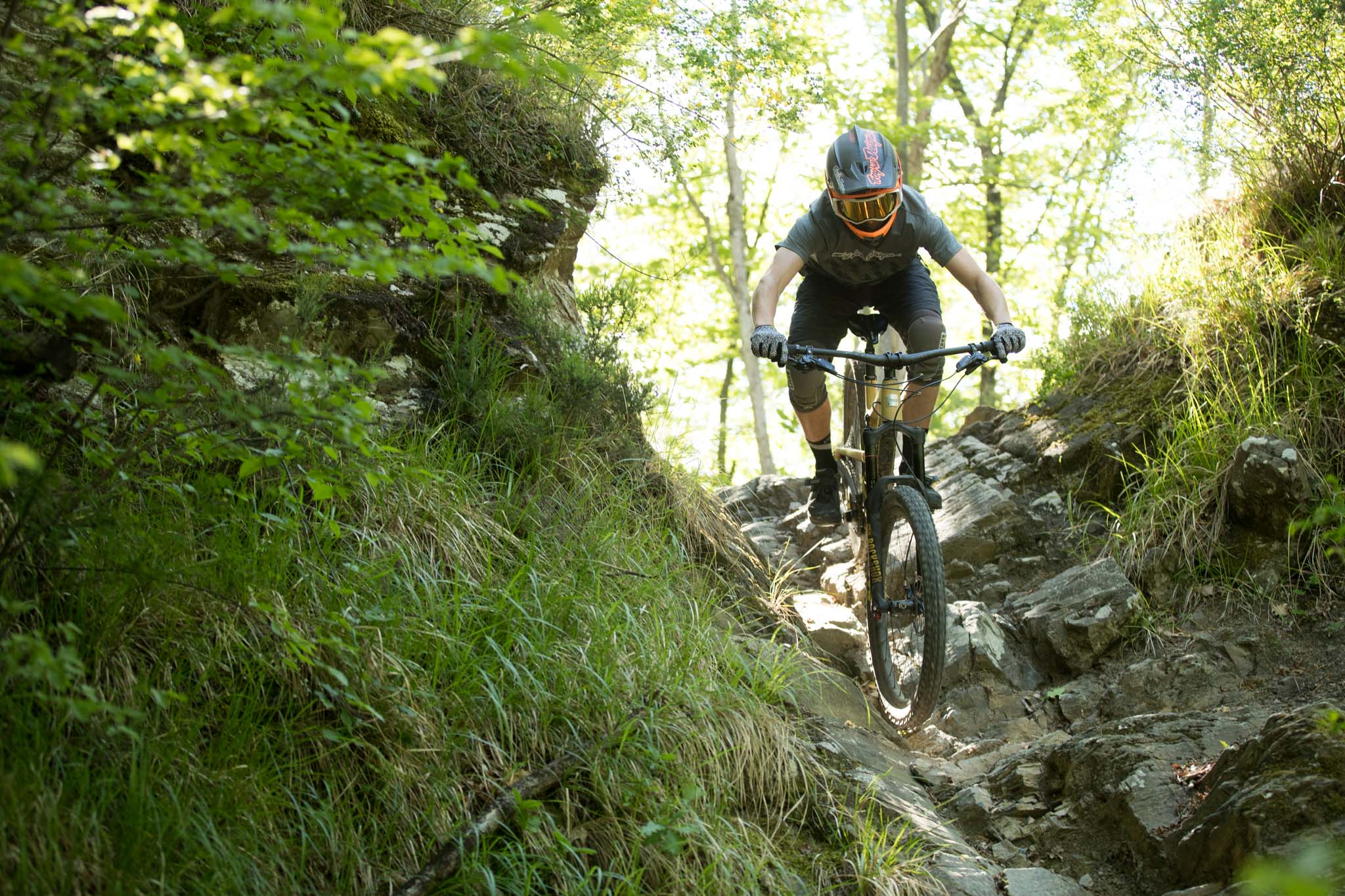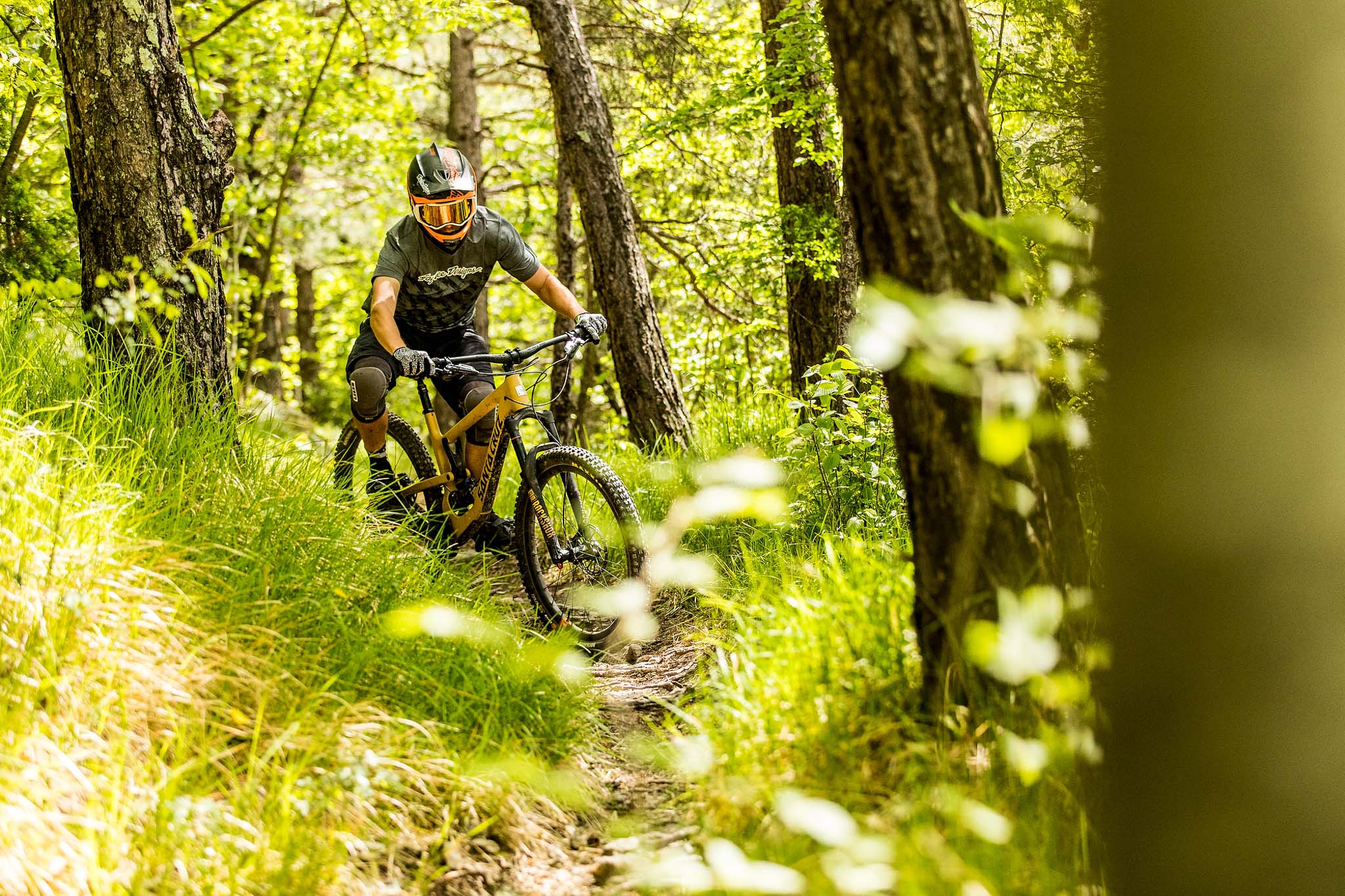Lancé sur les sentiers, Cédric Gracia aux fesses, on prend conscience que le changement de cinématique modifie totalement le vélo. C’est une arme en descente ! Pourtant, nous qui n’avons pas forcément l’habitude des vélos de descente, on s’y sent bien. Le cintre est très large (800mm), les pneus aussi (Maxxis Wide Trail, un très bon choix) mais nous ne sommes pas déroutés par ce qui pourrait être un « panzer ».