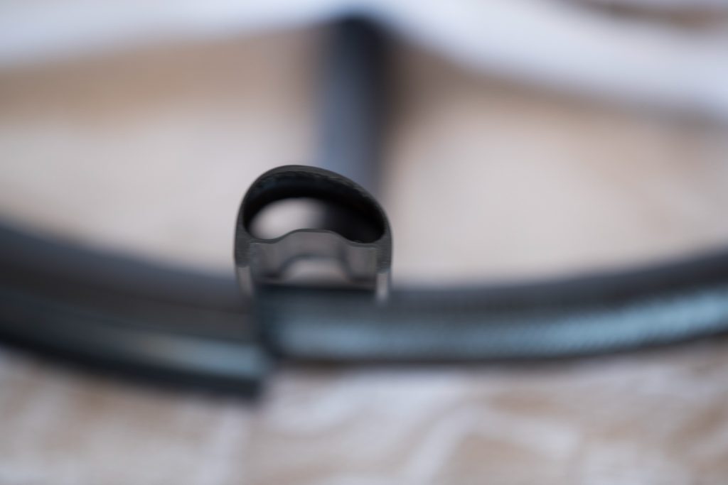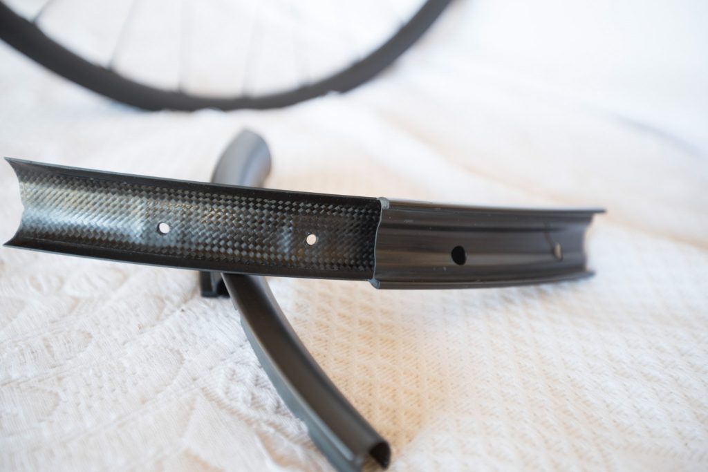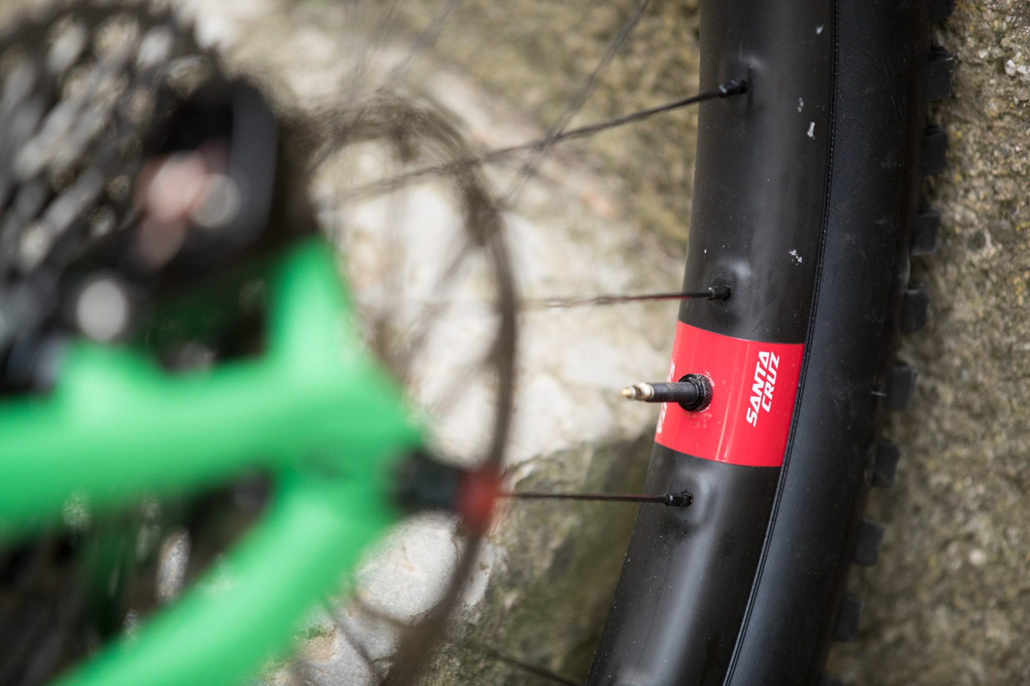 Esthétiquement, on repère des renforts aux niveaux des rayons. Santa Cruz se justifie en expliquant que « les roues en carbone ont tendance à céder quand une grande force « tire » sur les rayons. En plaçant les renforcements à l’extérieur, on s’assure que les jantes sont percées exactement au centre, ce qui est un problème pour nos concurrents, ce qui nous permet d’apposer des couches de carbone exactement là où nous en avons besoin et, donc, de gagner du poids. Nous pouvons ensuite nous permettre d’ajouter des couches de carbone là où la roue en a besoin, sur les flancs et sur les angles, là où les impacts sont les plus forts ». Les rayons sont donc accessibles en externe et renforcés par des Sapim secure lock en aluminium.