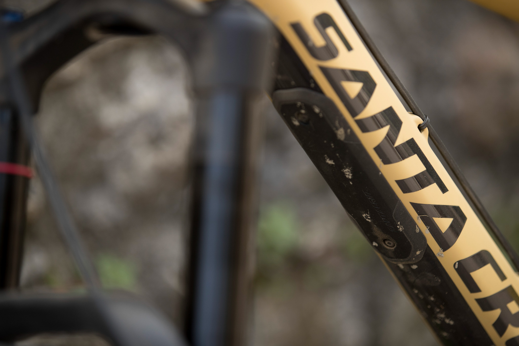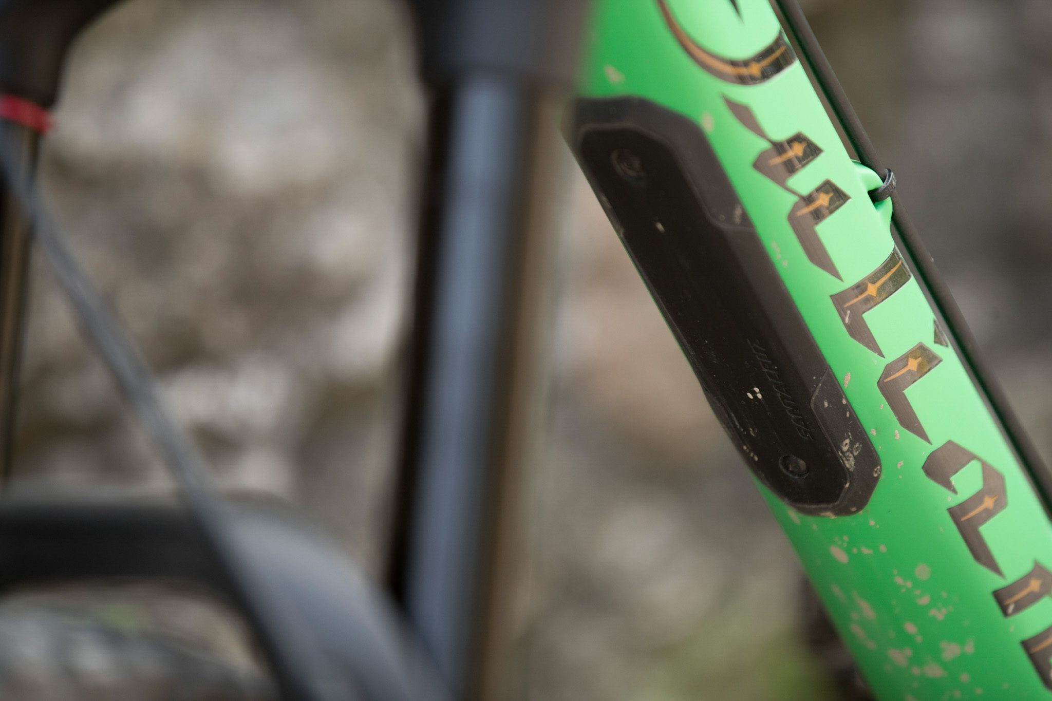 Le cadre est protégé sous le tube inférieur et sur les bases. Un petit garde boue est positionné juste derrière l’amortisseur. Les passages de gaines et de câbles se font en interne.