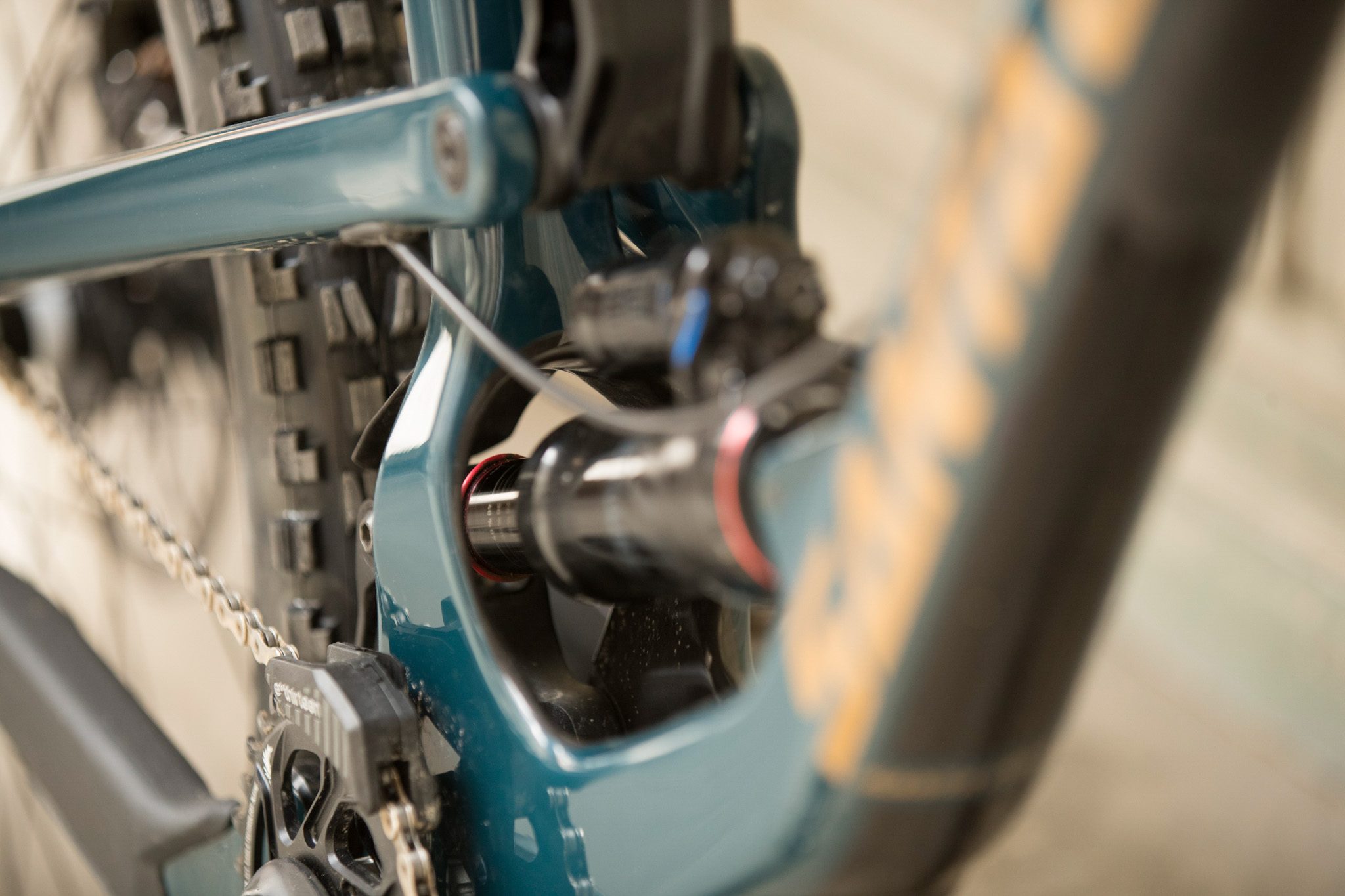 Le vélo a été conçu pour être utilisé avec tous les amortisseurs du marché et il est possible de choisir entre un amortisseur Rockshox Superdeluxe RCT Coil (ressort) ou Air. Lors de notre prise en main, nous avons eu l’occasion d’essayer les deux versions. Sur les versions les plus haut de gamme, les amortisseurs sont montés sur des roulements qui améliorent encore la sensibilité du vélo sur les petits chocs.