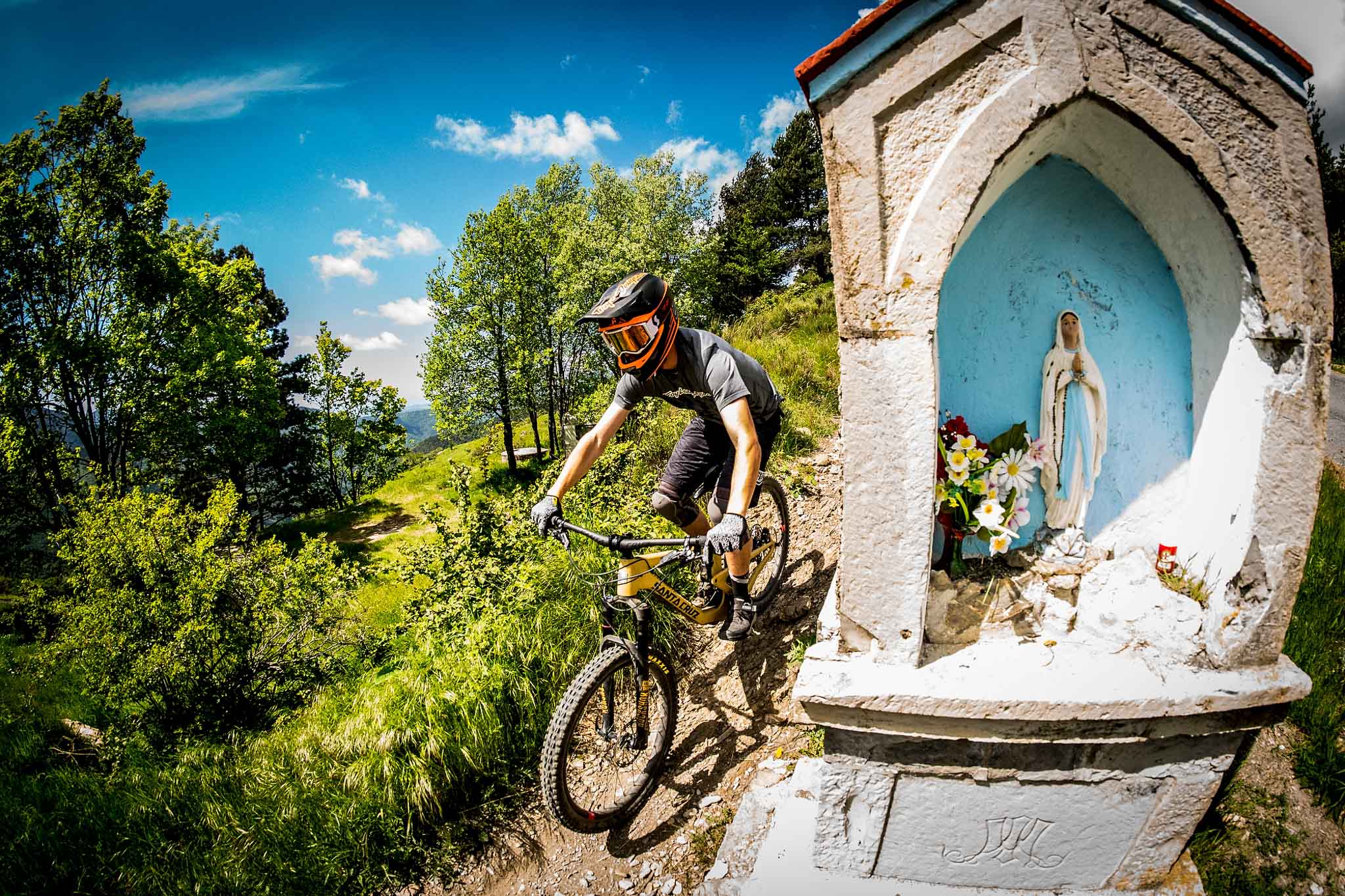 Santa Cruz a voulu faire les choses bien et suivre la philosophie qui se cache derrière les noms de ses vélos. Pour le côté Nomad, nous avons grimpé au guidon du vélo pour traverser des vallées et une frontière nous menant de France en Italie. Le périple nous faisant arriver à Triora, le village des sorcières, les fameuses Strega.