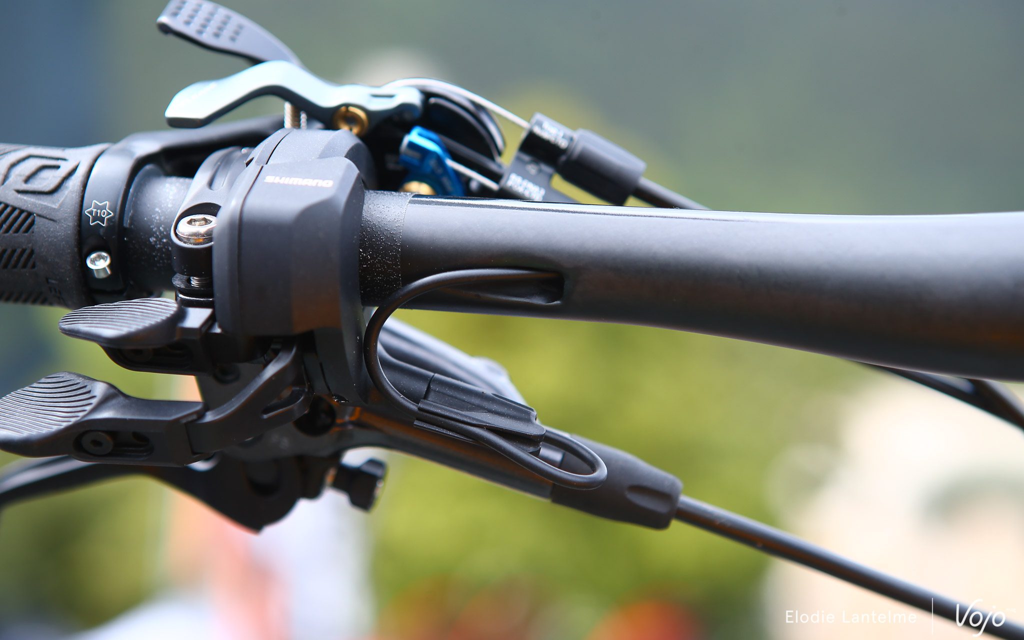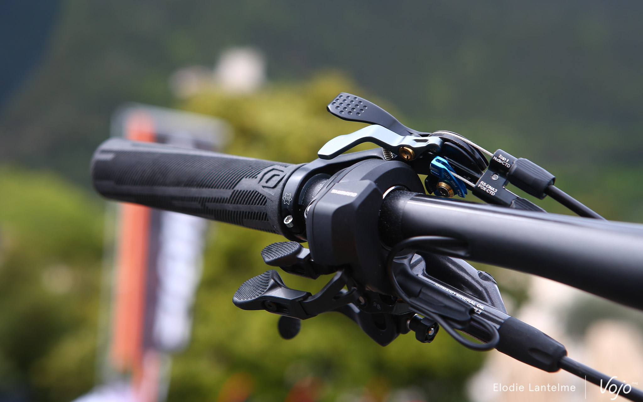 Mais avec 100 km d’autonomie annoncés en mode Éco, 75 en mode Trail et 50 en mode Boost pour une batterie à 100 % (après 5 heures de charge), on ne devrait pas en manquer ! On poursuit la découverte du poste de pilotage. Le moins que l’on puisse dire, c’est qu’il y a du monde au guidon ! Aux deux manettes du TwinLoc et à la commande de la tige de selle télescopique (pas proposée sur la version 720 – dommage), s’ajoutent le shifter présidant aux destinées du Shimano Steps E8000, que nous roulons pour la première fois. Malgré nos nombreux roulages avec des VTT électriques, nous n’avions pas encore eu l’occasion de tester le moteur Shimano, qui réalise, pour sa première année de commercialisation, une percée fulgurante sur le marché. Focus, Orbea, Mondraker, Scott et d’autres lancements de modèles 2018 à venir l’ont adopté.