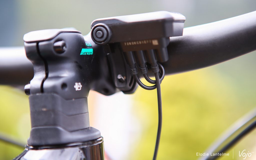 Mais c’est aussi au niveau de l’intégration des câbles qu’un effort particulièrement important a été réalisé : les gaines, y compris celles du display et de la liaison Di2 glissées dans le guidon Syncros Carbon, s’insèrent toutes dans le cadre alu du Scott e-Spark 700 Tuned Plus. Un résultat qui épure la ligne du vélo, tout comme le display Shimano, intégré avec soin au niveau du poste de pilotage et commandé par 2 shifters au niveau de la poignée gauche (mode Eco, Trail et Boost, nous y reviendrons… enfin, vous savez, quoi, on en reparle vite !).