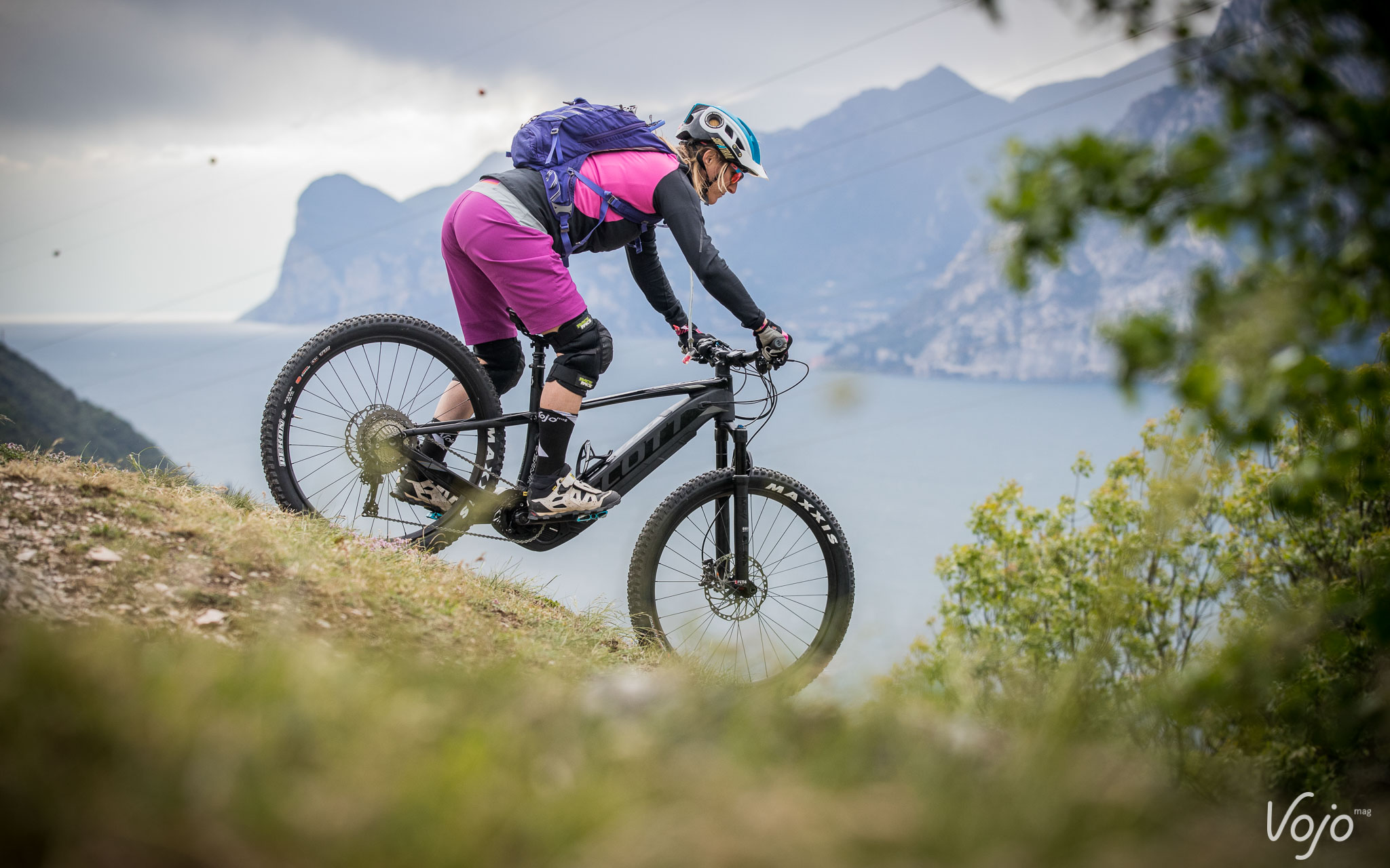 On allume le Shimano Steps E8000 d’une pression sur la batterie, les témoins sont au vert, go ! La petite troupe menée par Holger Meyer (à droite de l’image), figure historique du mountain-bike et ambassadeur Scott depuis le début des années 2000, s’ébranle sur la piste cyclable des bords du lac de Garde. On en profite pour jouer avec le TwinLoc, qui actionne amortisseur et fourche conjointement, sur 3 positions pré-réglées (tout ouvert, trail et fermé). Même si le propre d’un VTTAE est de proposer une assistance, qui peut gommer sans effort la baisse de rendement liée à davantage de pompage, on apprécie de pouvoir rouler en position bloquée sur le goudron des rives : il n’y a pas de petites économies en matière de batterie, se dit-on.