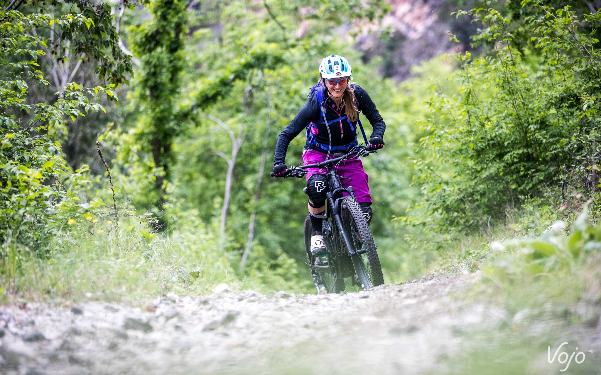 Et à voir les sourires radieux de la petite troupe au bas de la piste, le cocktail était bon ! Seules les multiples crevaisons (chez la quasi-totalité des rouleurs français, votre serviteure exceptée – d’ailleurs) ont ralenti l’allure. À l’arrière, dans les tracés engagés ponctués de pierres saillantes, le Maxxis Rekon+ a souffert malgré sa carcasse Evo. Ce fut bien là la seule souffrance de cette sortie. 63 kg pour la pilote au guidon, 22 km de roulage avec 70% d’utilisation en mode Boost n’ont croqué qu’une des 5 bûchettes de la batterie.