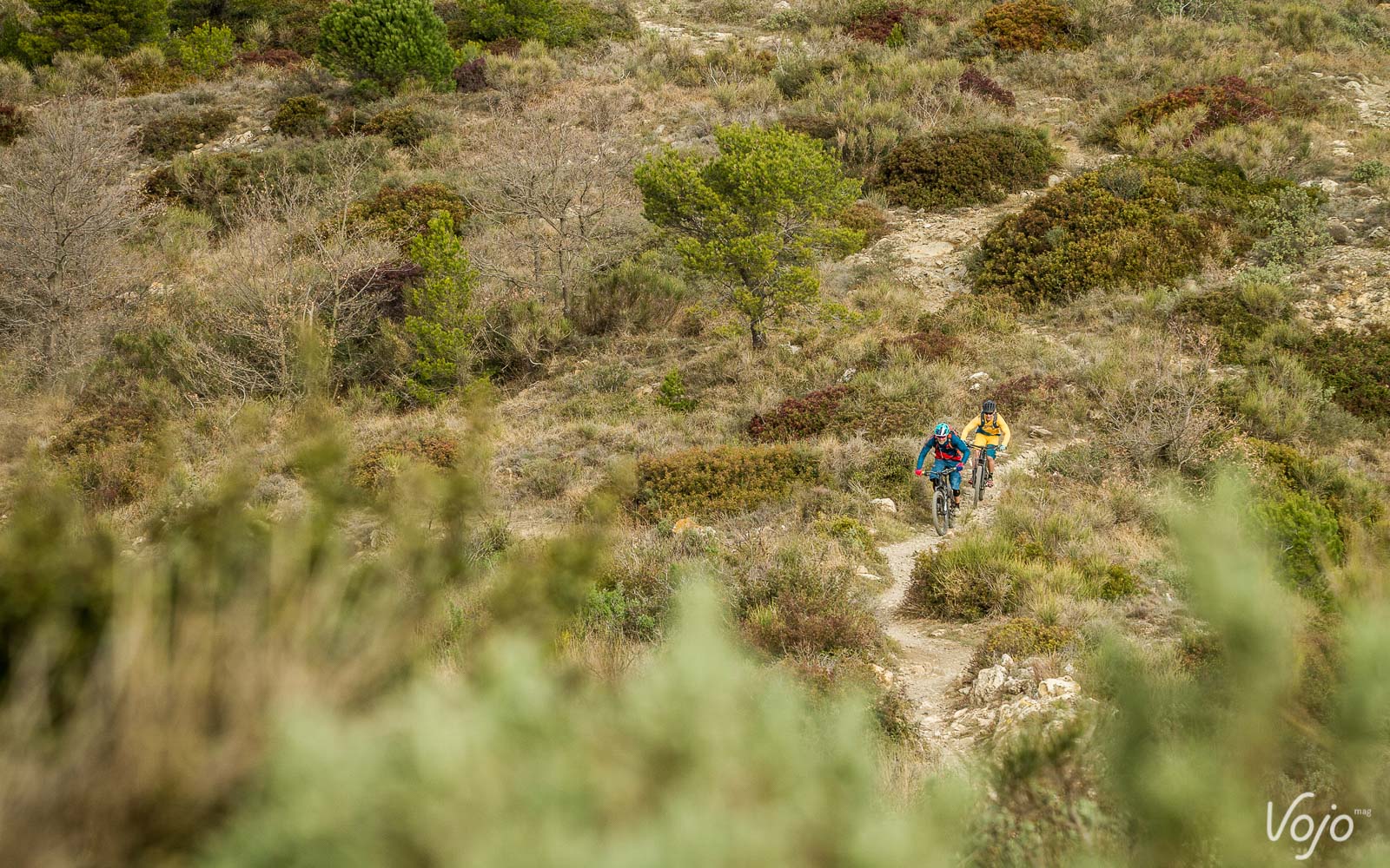 La première montée raide dans de grosses pierres le confirme : il va falloir piloter différemment pour ne pas perdre la motricité et bénéficier vraiment des watts de ce moteur. Le TwinLoc en mode intermédiaire, un doigt sur le frein pour canaliser la propulsion et la diffuser aux endroits opportuns en « asseyant » le vélo, la roue arrière le plus chargée possible, on se rapproche d’un pilotage moto. Mais qu’est-ce que c’est ludique et réjouissant de parvenir en haut quand, en vélo musculaire, on aurait peiné à franchir le premier tiers de ce « pétard » !