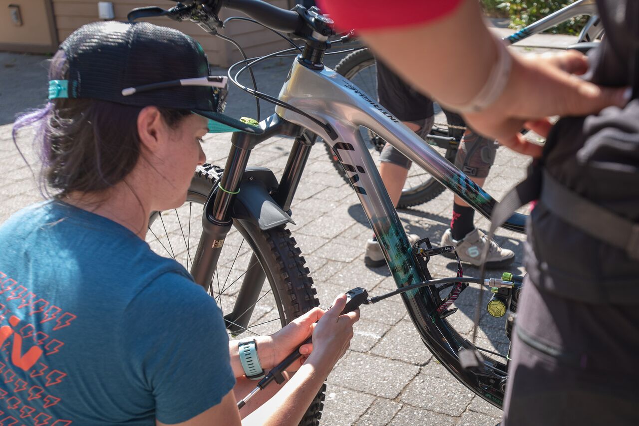 Pour régler l’amortisseur DVO, Liv recommande d’ajuster le SAG juste sous la base des lettres, facile à repérer. 80 PSI dans la fourche, 1,5 bar dans le pneu arrière, 1,4 à l’avant… reste le tube de selle à ajuster.