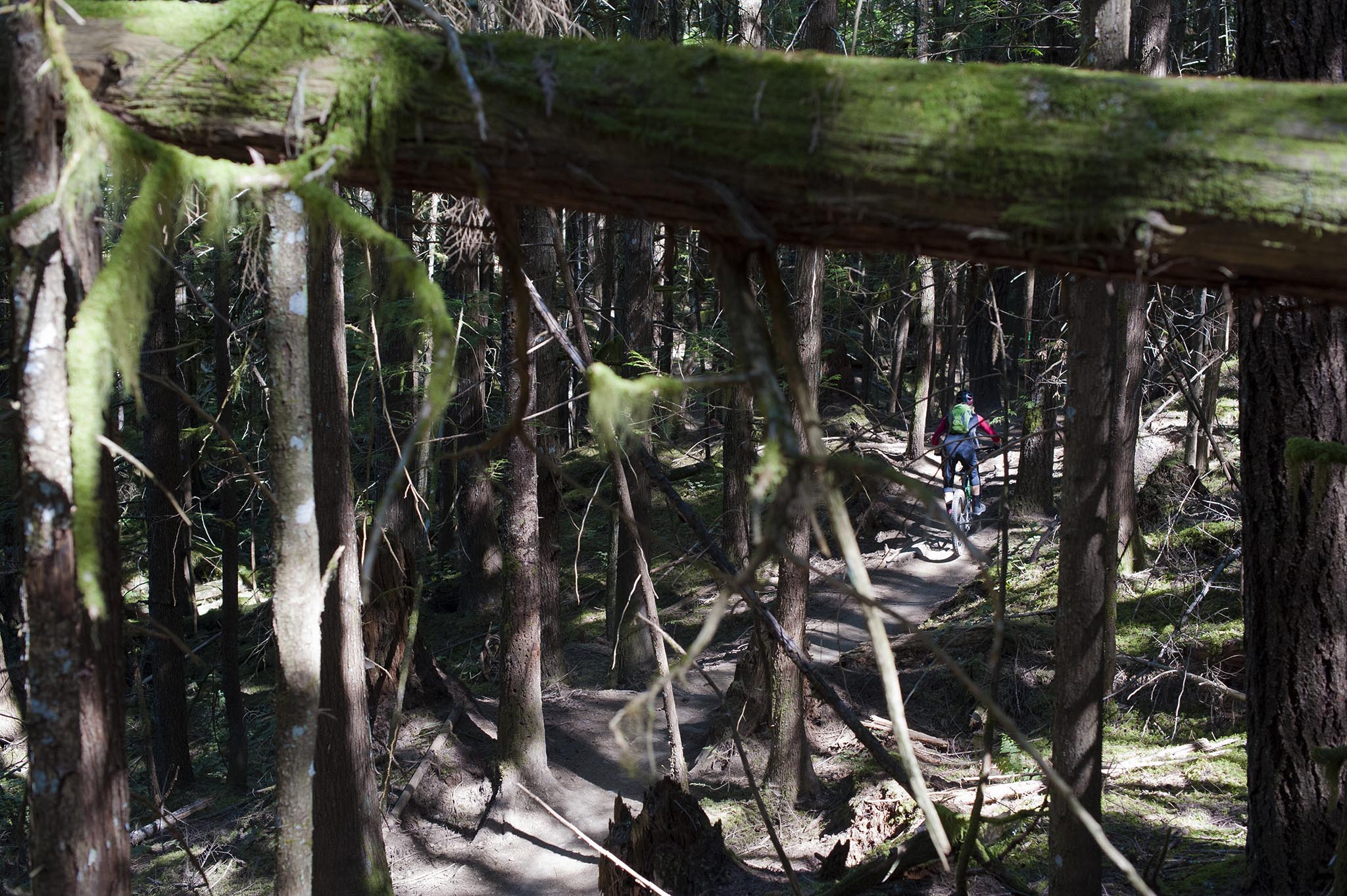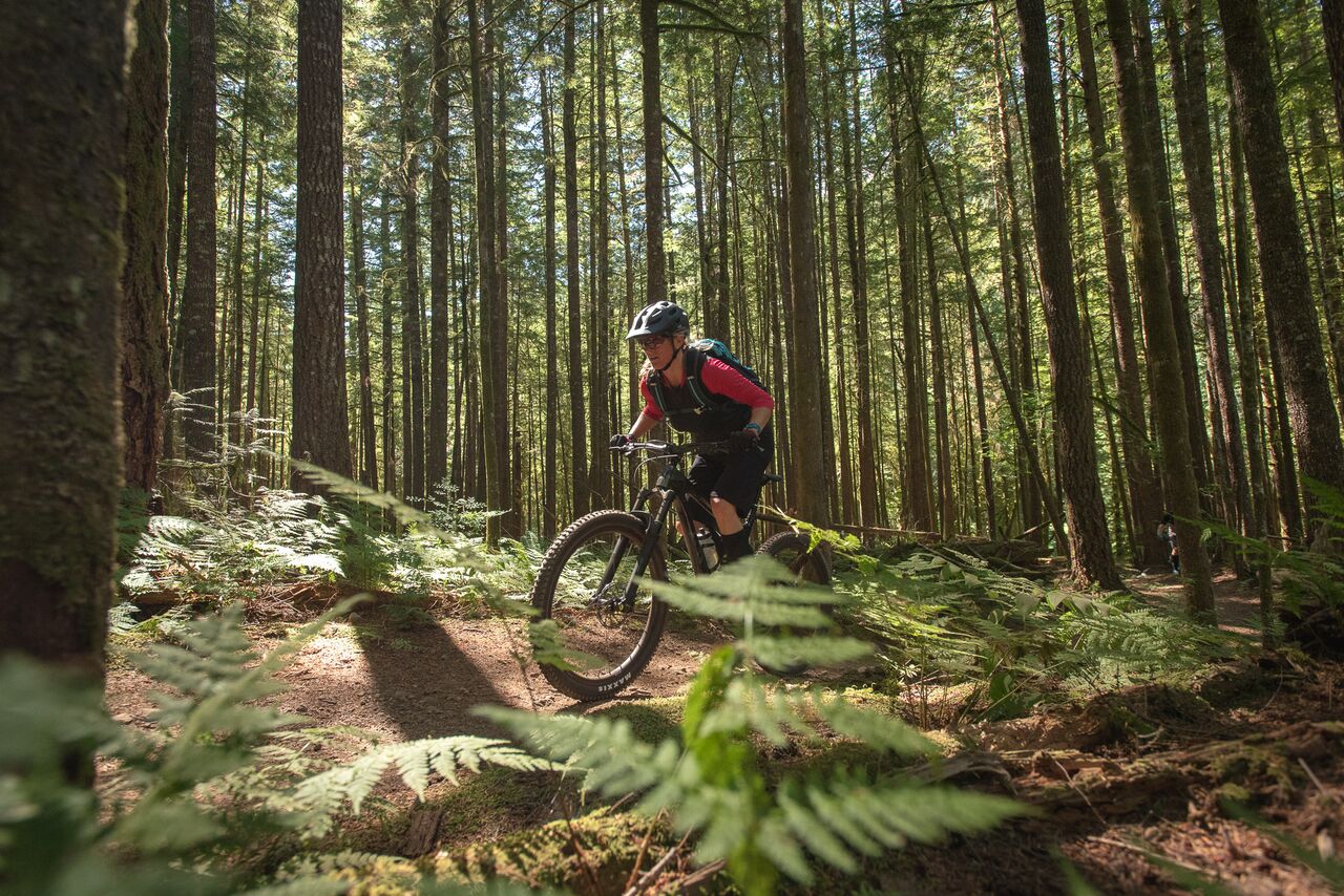 Place enfin à la découverte des véritables trails de Squamish ! Et ça commence fort, par la longue montée en forêt de Fifty Shades of green. L’étagement de la transmission fait merveille, ce ne sont pas les pignons qui manquent, mais plutôt les jambes sous cette chaleur écrasante, qui réclameraient presque une section de pneus un brin plus fine.