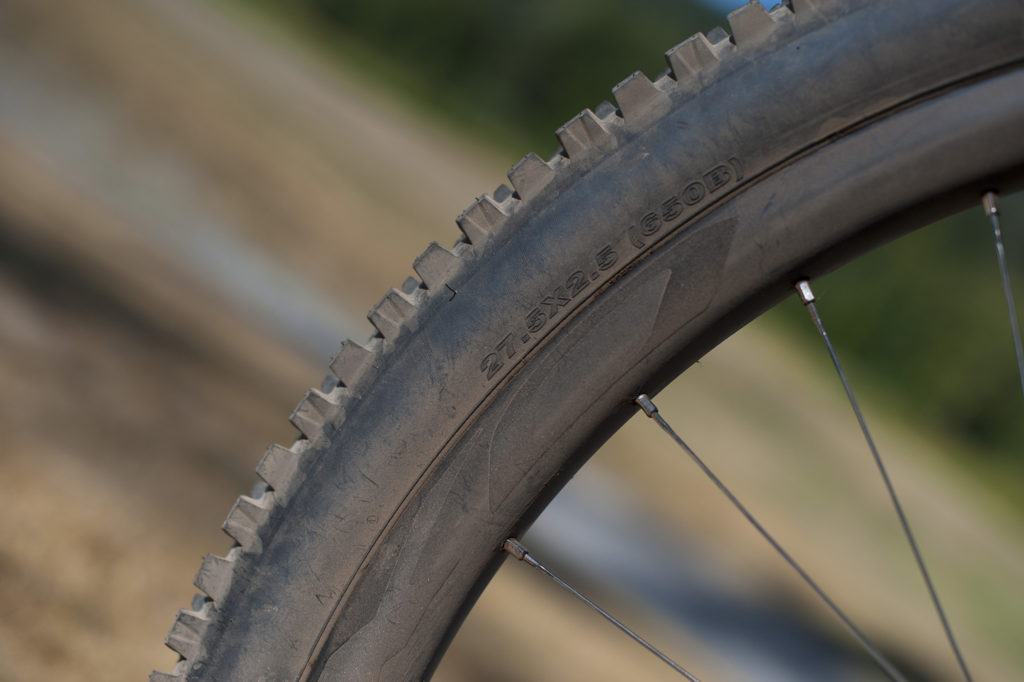 L’ensemble supporte des Maxxis High Roller II en 27,5 avec des sections différenciées : 2.5 à l’avant pour plus de stabilité, et 2.4 à l’arrière, pour moins grever le rendement. Le tout étant compatible avec un montage en 2.6 pour gagner encore en sensation de sécurité, quitte à y laisser un peu plus d’agilité et – surtout – en rendement.