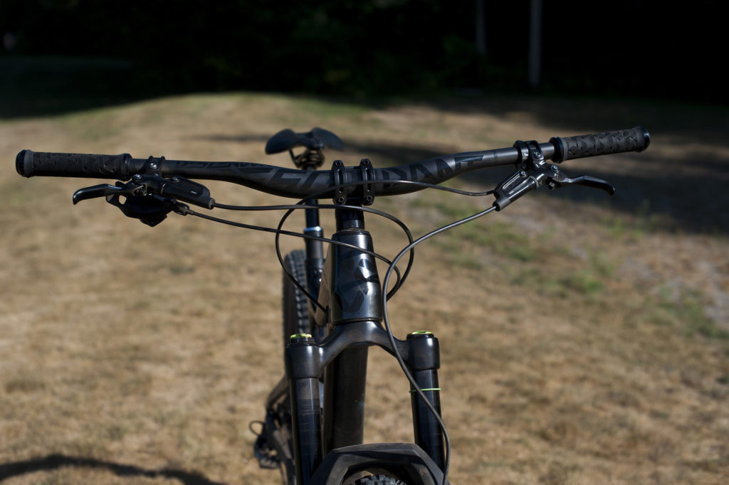 Un cintre Truvativ Carbon Descendant en 780 mm pour les tailles M et L (760 pour S et XS) est couplé à la potence Aka de la même marque.