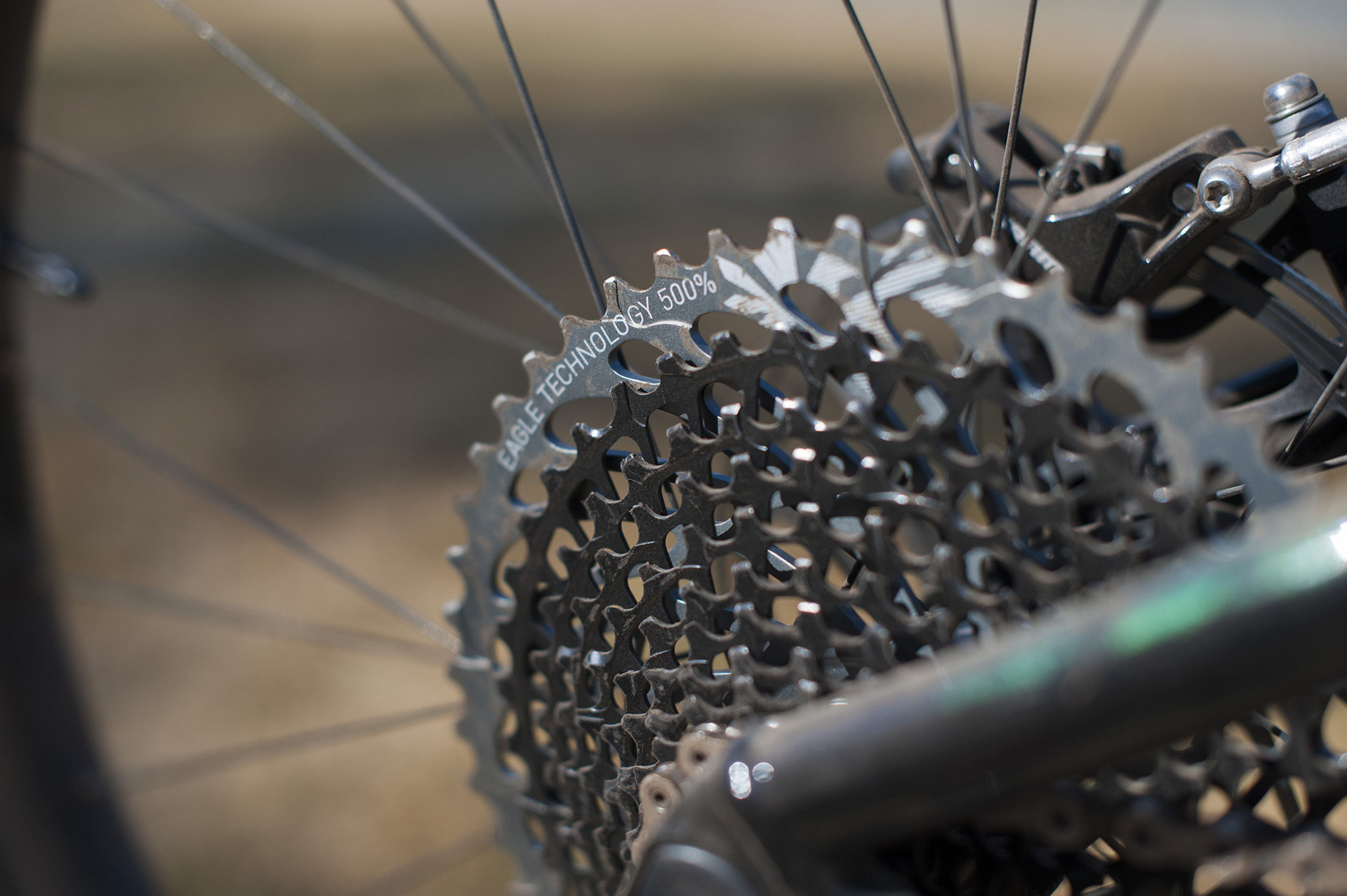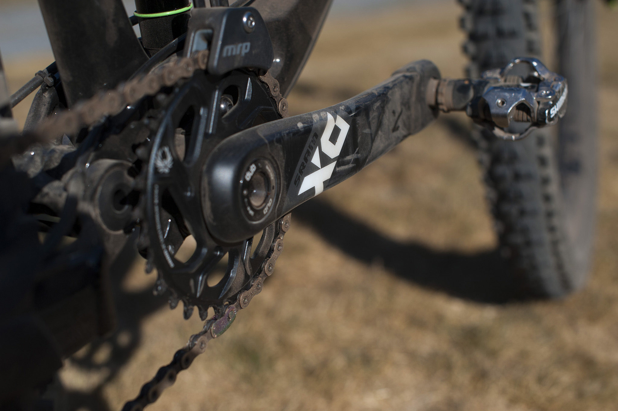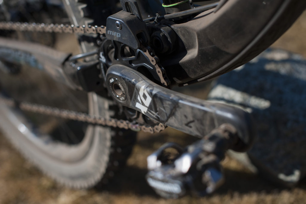 La transmission est confiée à Sram avec son Eagle X01 en 1×12 (plateau de 30 dents à l’avant, cassette en 10×50 à l’arrière, pour un étagement le plus large possible) et se retrouve protégée par un guide-chaîne MRP.
