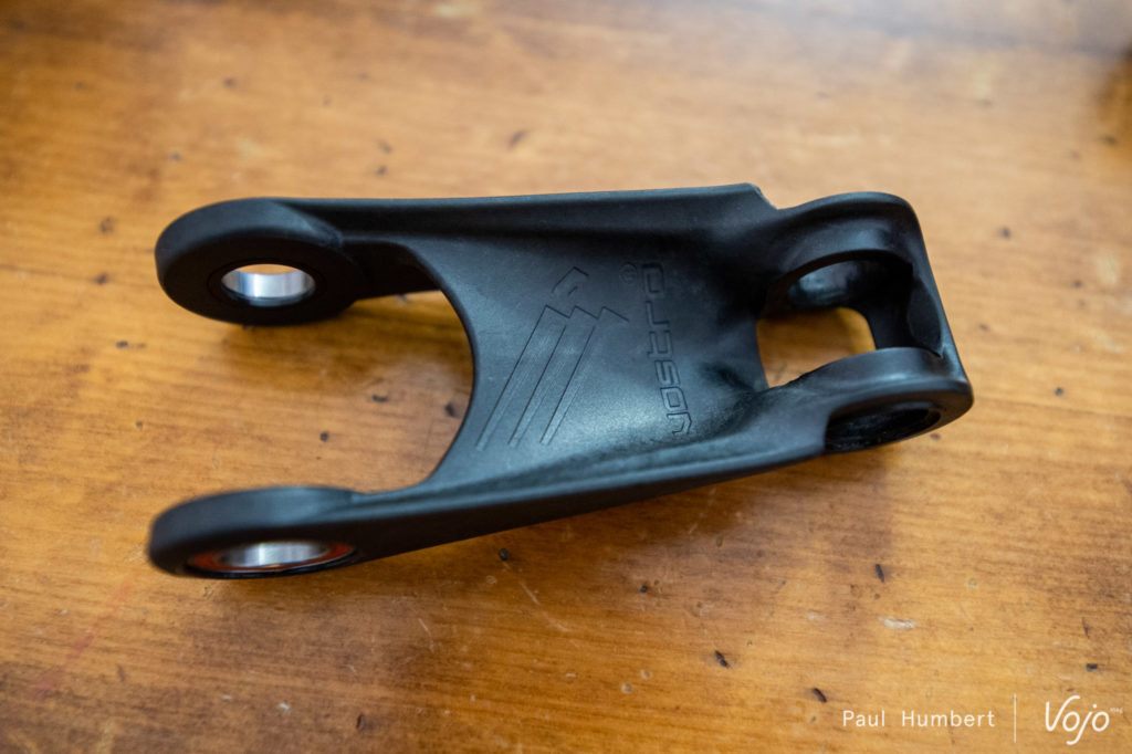 Jusque là, le Mount Vision est identique au Wolf Ridges. La différence se situe dans l’ajout d’un basculeur en carbone ancré sur le tube supérieur. Ce dernier rend le travail de la suspension plus progressif afin de dynamiser et de rigidifier la machine (un point qui laisse à désirer sur le Wolf Ridges dont notre test longue durée est à paraître rapidement).