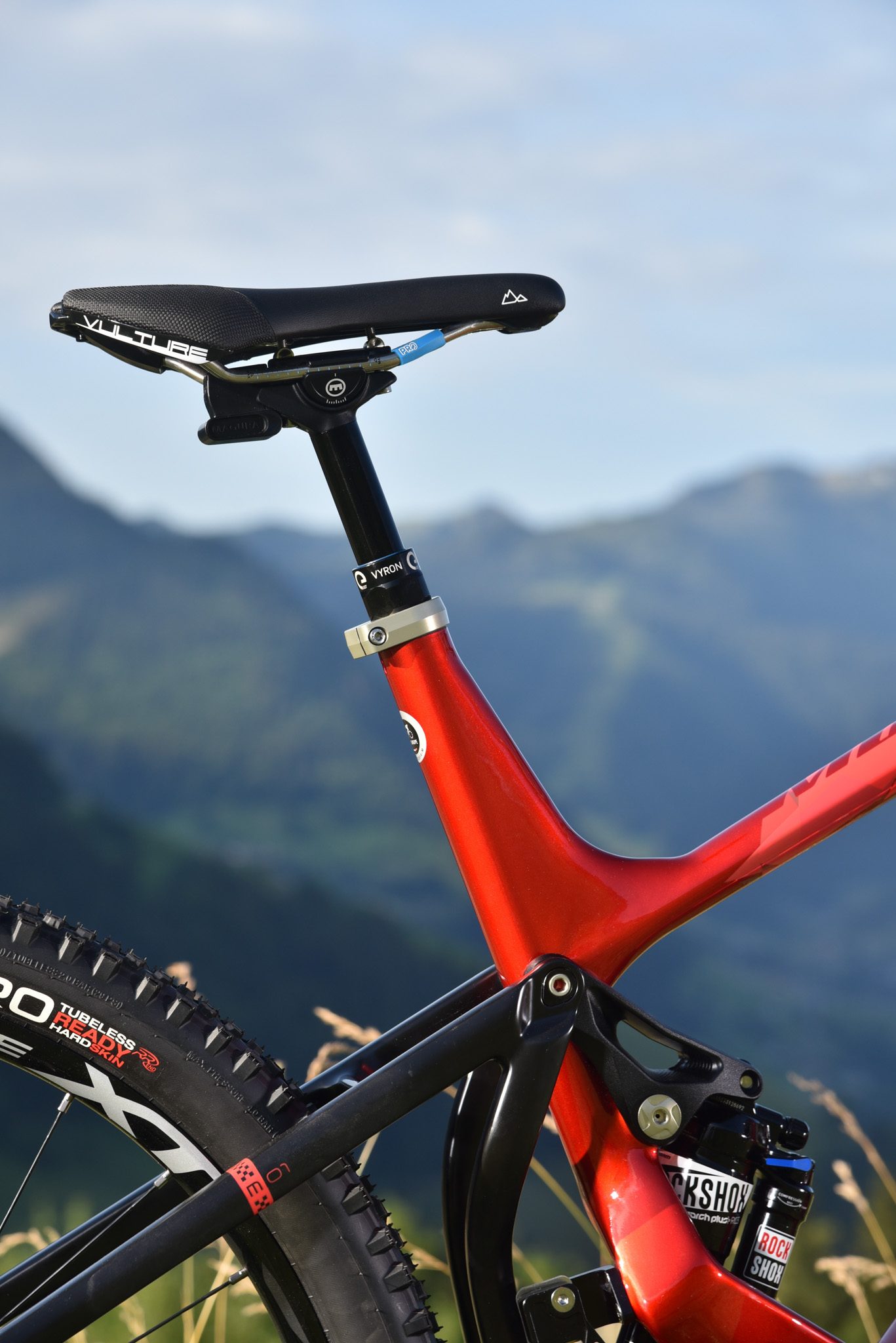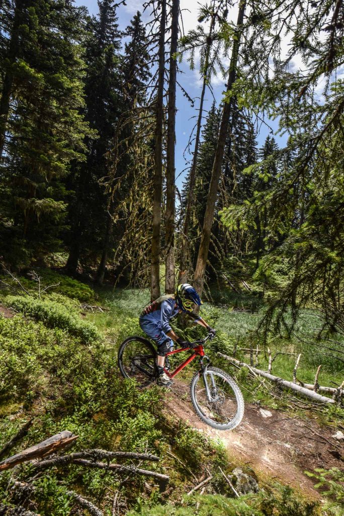 Ce qui étonne de prime abord, c’est la facilité de prise en main du M01 FS. Au bout de quelques kilomètres, on a l’impression de déjà bien le connaître et de n’avoir pas dû s’adapter à sa géométrie. Ce à quoi on doit s’adapter, en revanche, c’est le fonctionnement de la tige de selle Magura Vyron. Délai de réponse allongé, commande erratique (mais liée, nous a-t-on dit, à un besoin de reconfiguration; renseignements pris auprès de Magura, aucun autre comportement de ce genre n’avait été observé au préalable, un élément à vérifier, donc, au cours d’un essai longue durée), elle ne s’avère effectivement pas pertinente pour coller à la réalité changeante du terrain, entre relances et sections plus engagées qui invitent à moduler souvent la hauteur. Bilan : on roulera souvent la selle en bas et on se félicitera qu’un autre choix, plus accessible, ait été fait pour la série (quoique la Magura reste une option).
