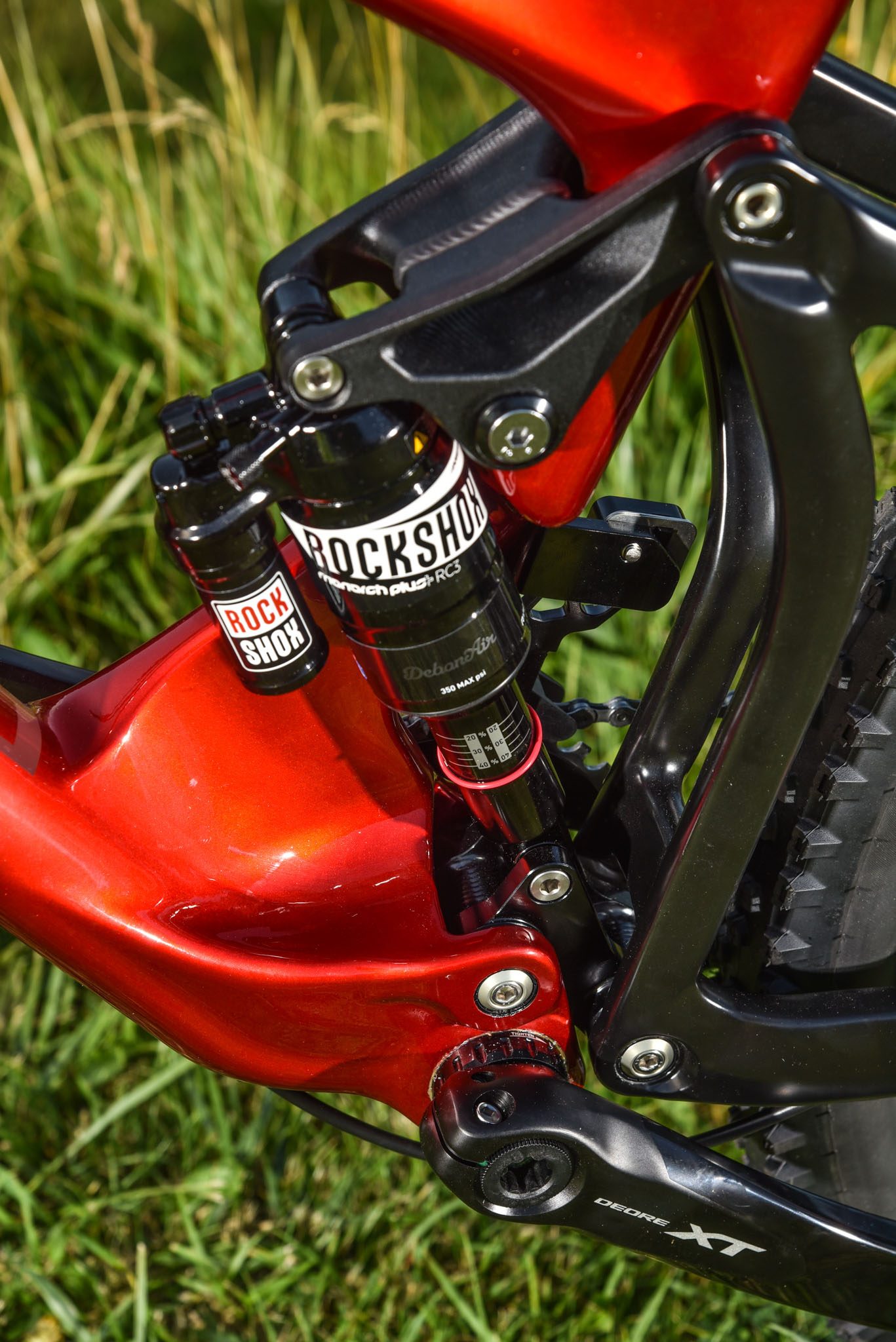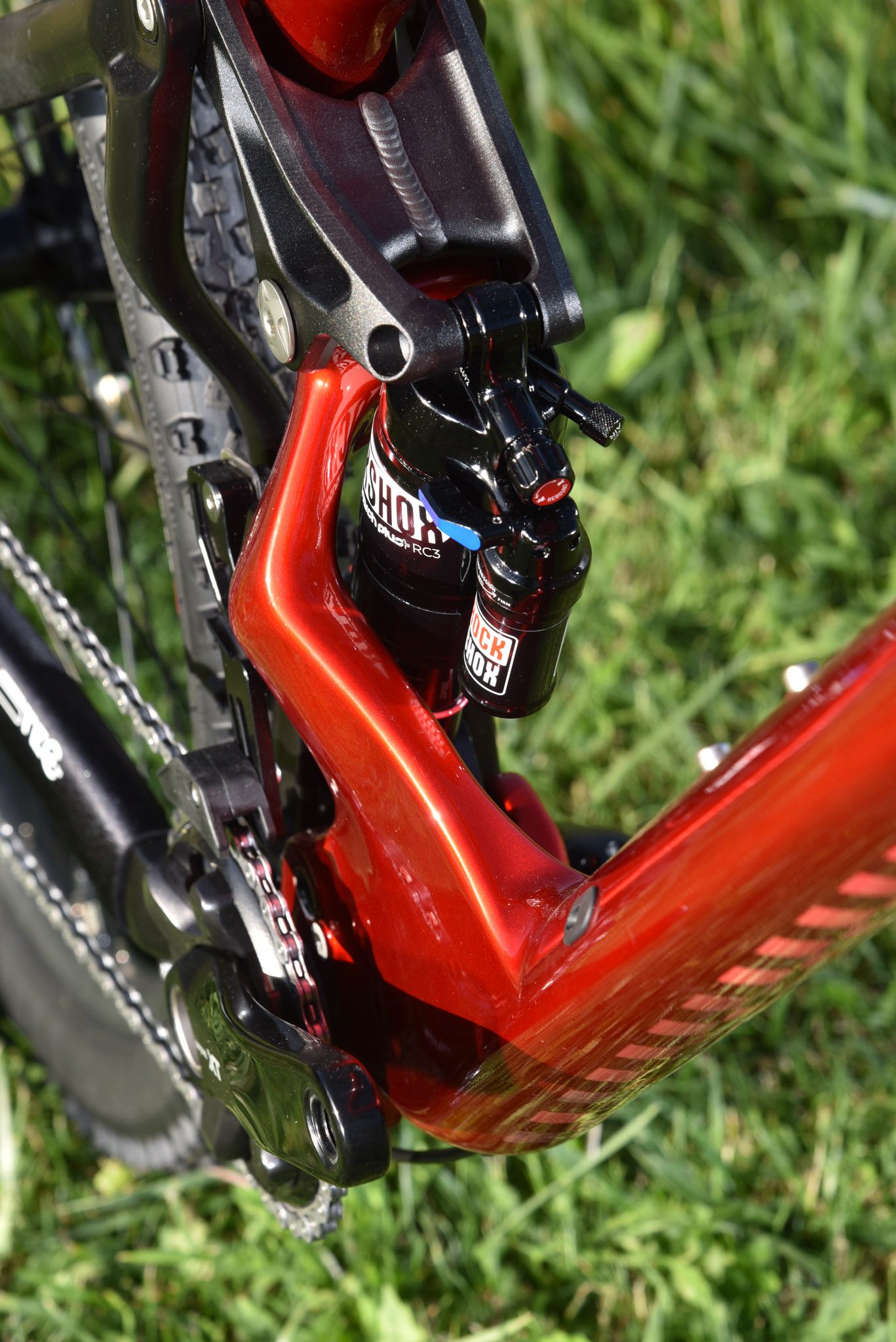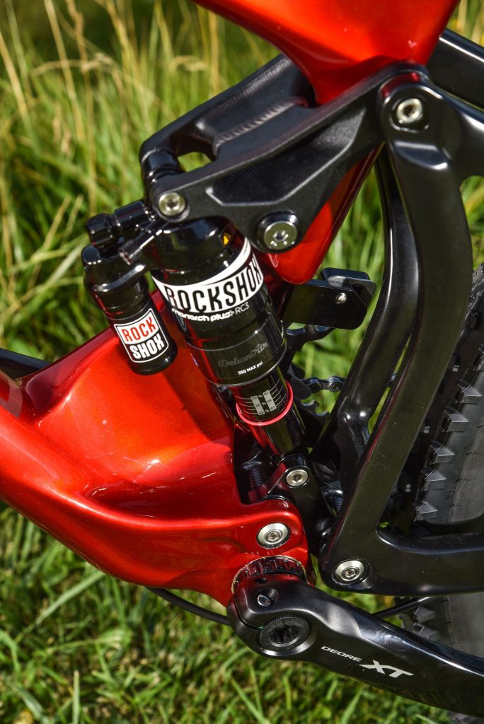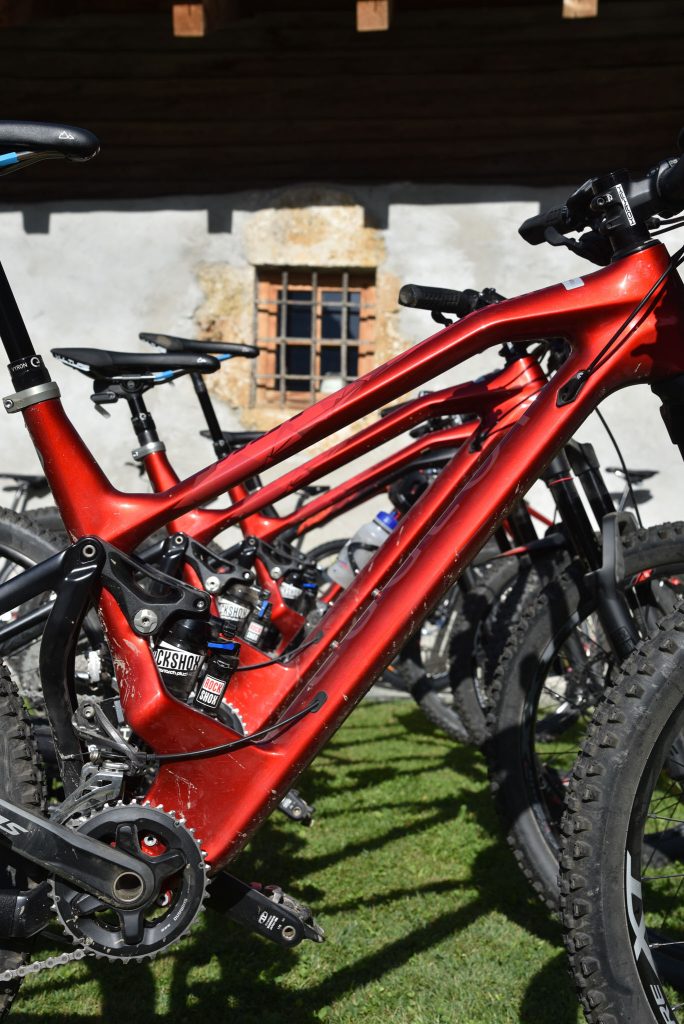 Dans les portions descendantes, le cadre met en confiance. Ses 67° d’angle et son top-tube de 420 mm (en taille 42 ; 460 en 46 et, logiquement, 500 en 50) ne basculent pas sur l’avant même si les « vrais » vélos d’enduro offrent aujourd’hui des valeurs plus engagées. Que ce soit dans les racines de la Vachette, les portions plus pentues ou les feuilles mortes recouvrant les pierres de la Toutafond, la cinématique VPP laisse le combiné RockShox lire le terrain avec exactitude, bien aidée par la rigidité du triangle arrière, la section de 2,35 à l’avant, qui favorise le confort autant que la sécurité, et les très bons Hutchinson Toro.