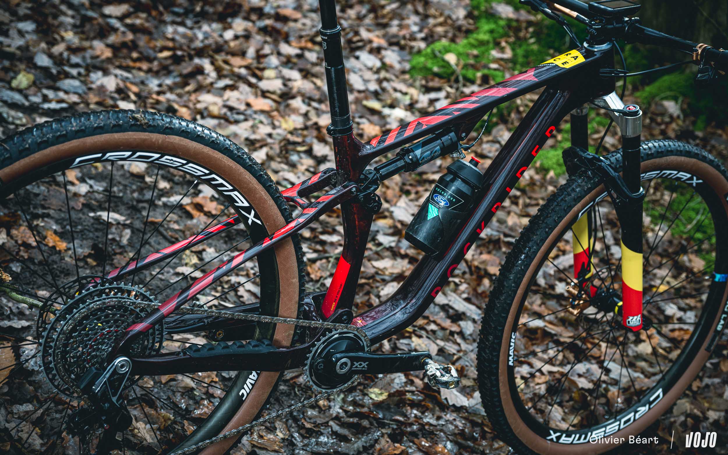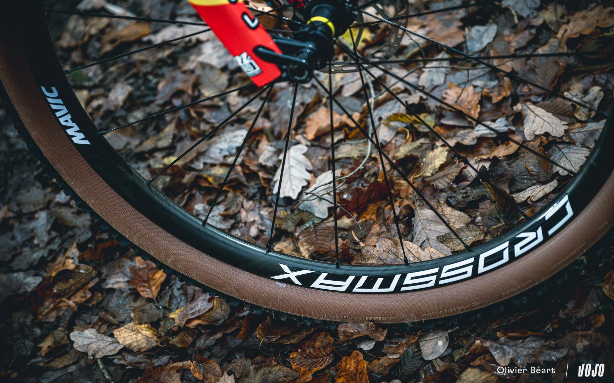 Les roues Mavic Crossmax SL Ultimate sont associées à des pneus Hutchinson. En coupe du monde du XC, le profil très roulant Skeleton est fréquemment choisi par les pilotes, et presque toujours avec des gommes ou carcasses « Racing Lab » développées spécialement pour eux. « Le Kraken est aussi régulièrement utilisé par certains dans le team » nous glisse Emeline. Notons que la version « Team Replica » sera équipée de Mavic Crossmax SL, et non SL Ultimate, afin de conserver un tarif raisonnable.
