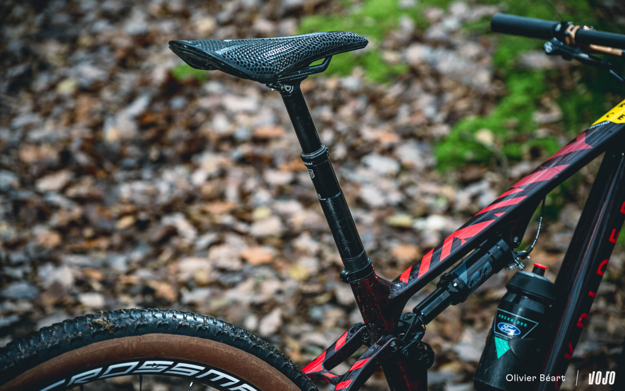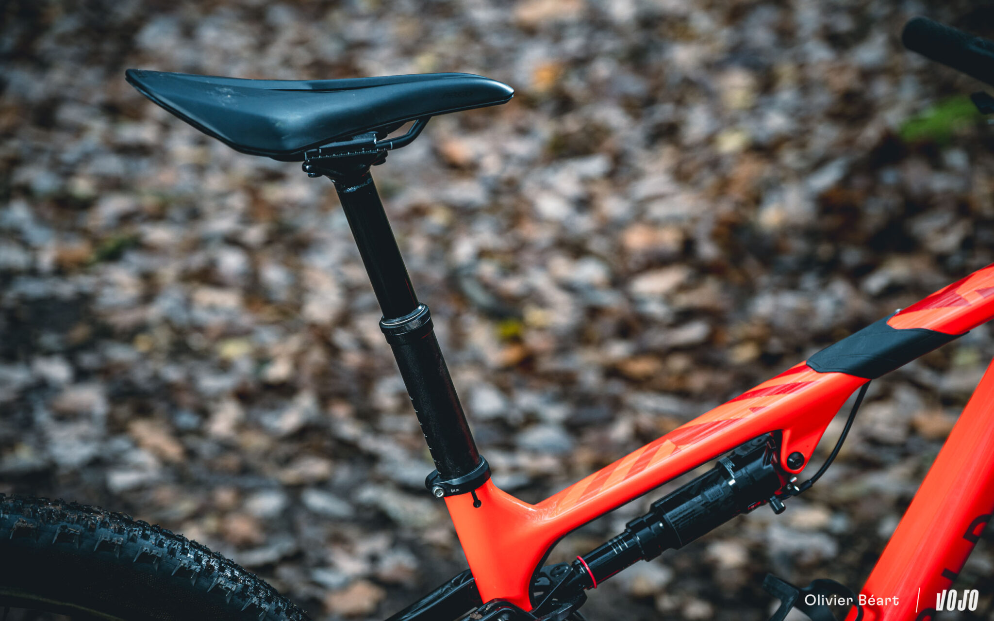 La tige de selle est une TransX haut de gamme qui pointe aux alentours des 450 g sur la balance. « C’est la même cartouche que sur une grande série des vélos de notre catalogue, elle est donc largement éprouvée. Par contre, elle bénéficie ici d’un corps plus léger », détaille Luis.