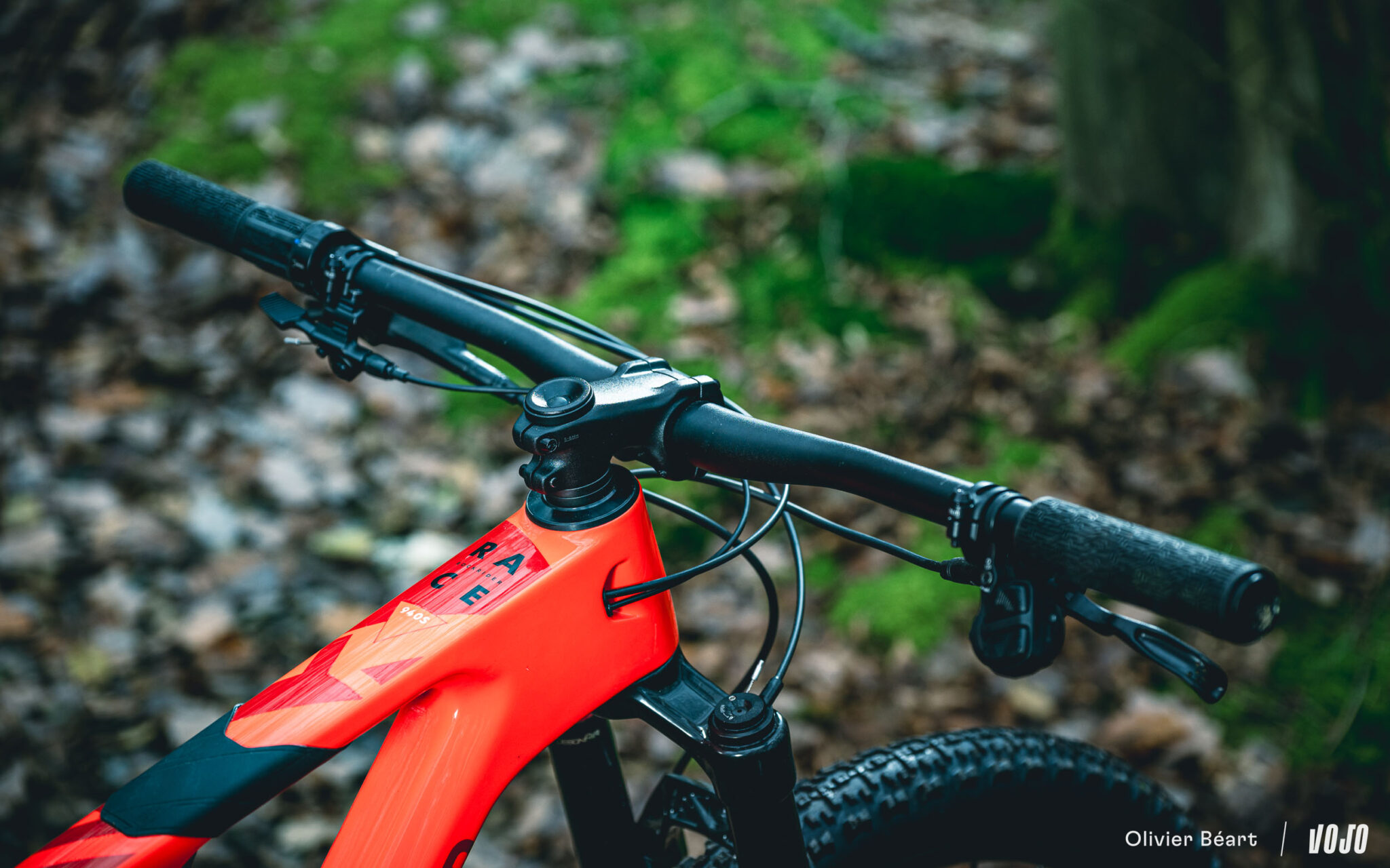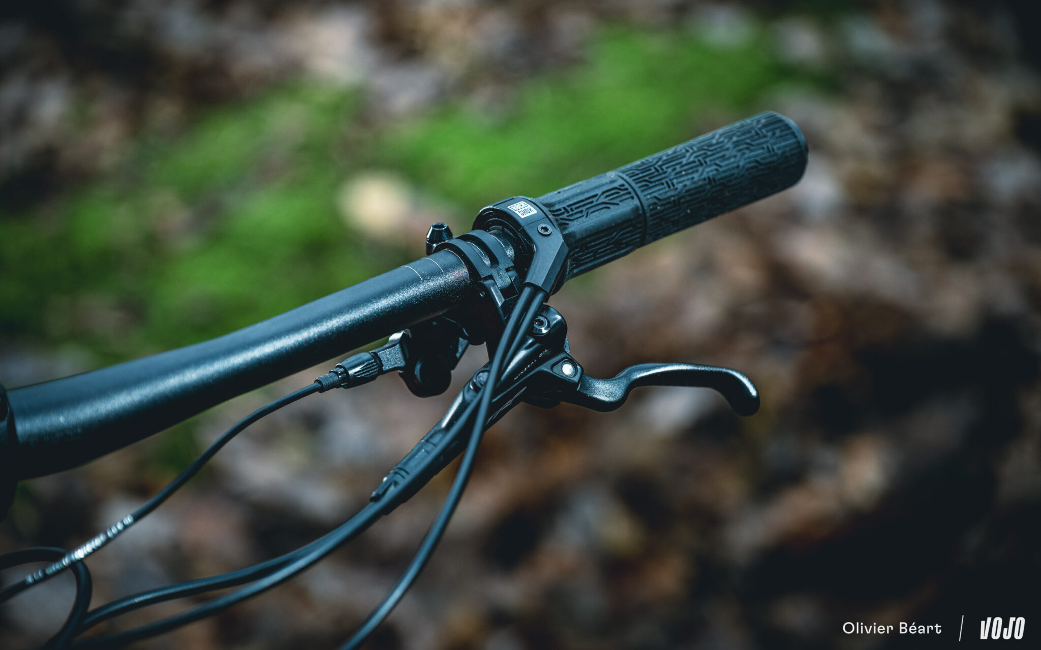 Le poste de pilotage est maison, avec un cintre en aluminium qui affiche 260 g sur la balance. « C’est un bon cintre pour de l’alu, mais il y a peut-être à gagner un peu en confort avec un cintre en carbone offrant davantage de flex. Il faut aussi noter que l’intégration par le tube de direction est possible, même si elle n’est pas prévue de série », explique le Product manager.