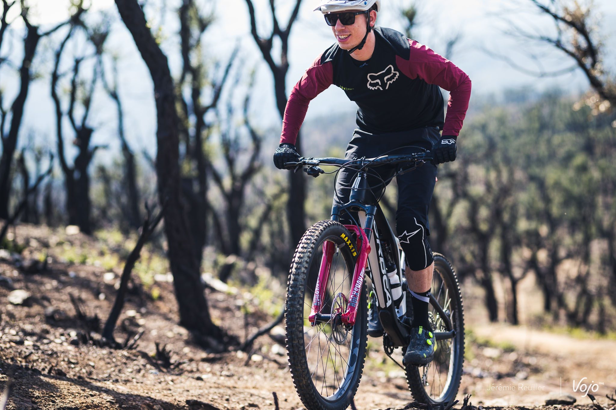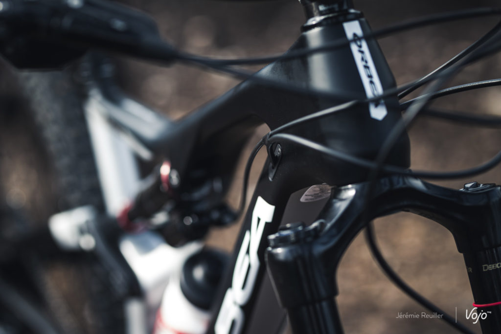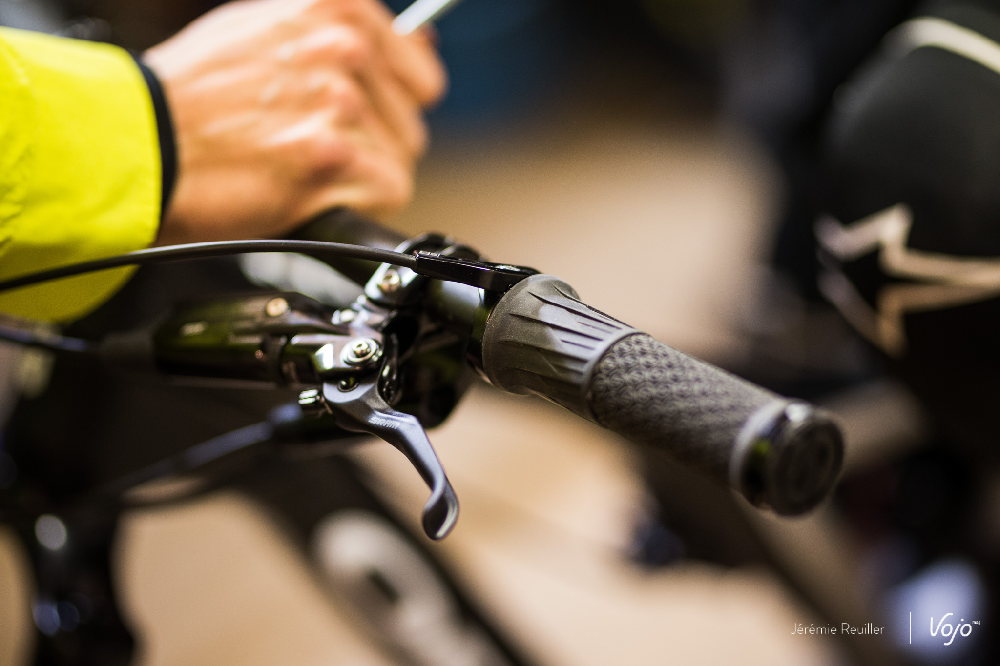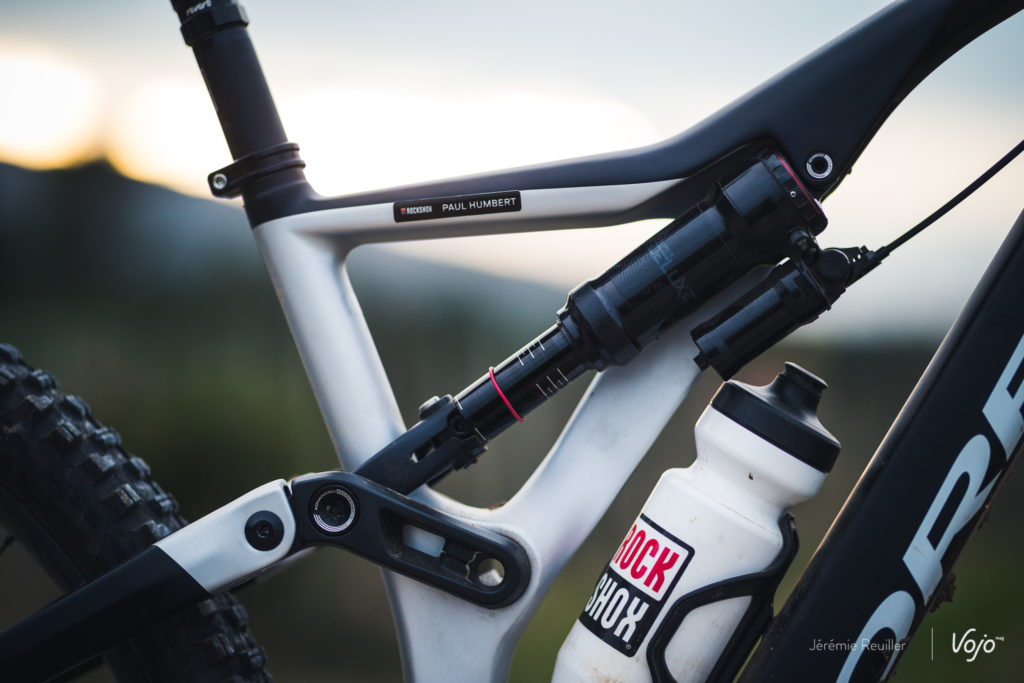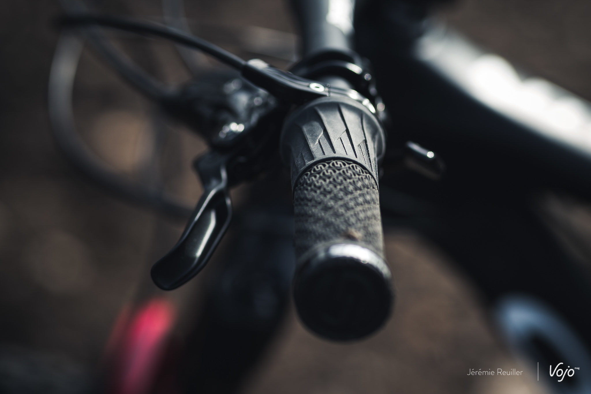 On ne lésine plus sur le blocage avec cette poignée Twistloc qu’on active à la moindre petite relance. Cette dernière répond présent et s’utilise sans encombre. Il faudra simplement intégrer un mouvement supplémentaire dans la transition « montée-descente » en jouant simultanément avec le shifter du dérailleur arrière et la commande de tige de selle. Le temps de notre petite prise en main, on repère toutefois un cache d’accès au câble un peu tremblotant – la maladie de ce prototype, nous annonce-t-on – mais le reste semble fiable et prêt à être lancé en production. Les amortisseurs 3 positions ne sont toutefois pas compatibles pour le moment avec cette commande.