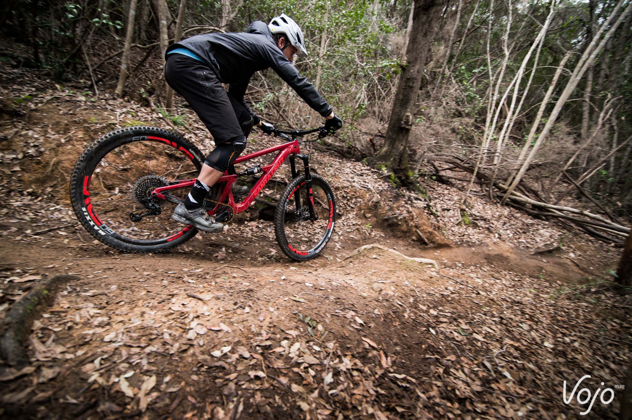 La première phase de réglage du vélo nous a demandé un petit peu plus de temps qu’habituellement. En effet, avec un SAG à 30%, il nous était difficile de prendre tout le débattement, même dans les portions défoncées. On ne ressent pas d’inconfort mais autant aller au fond des choses. Finalement, c’est vers 35% du débattement qu’on s’arrête en conservant toujours de très bonnes performances à la pédale.