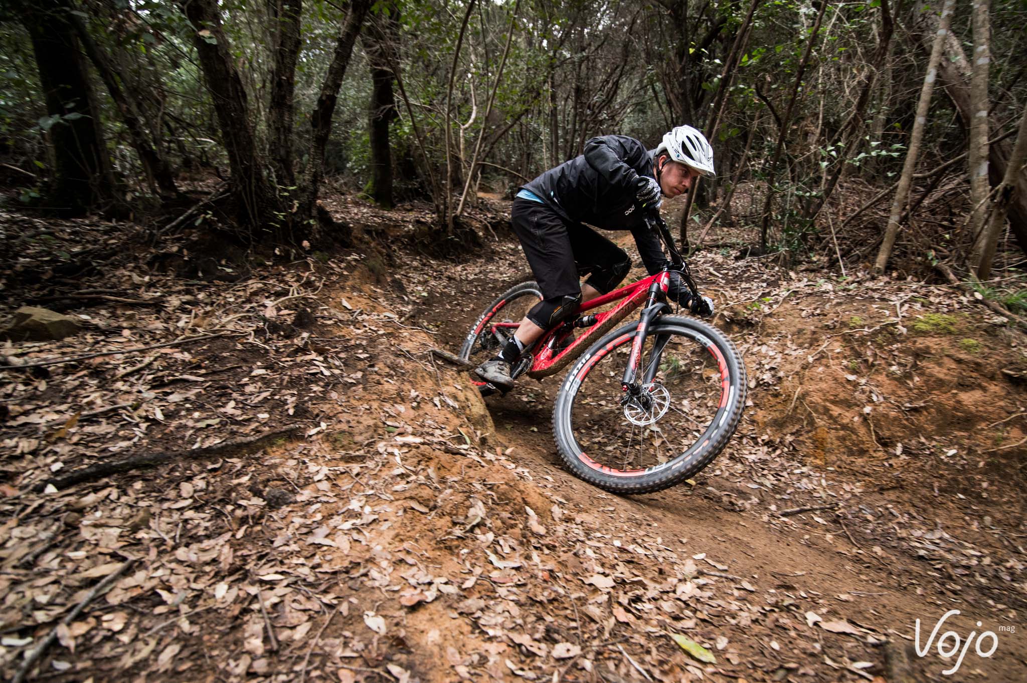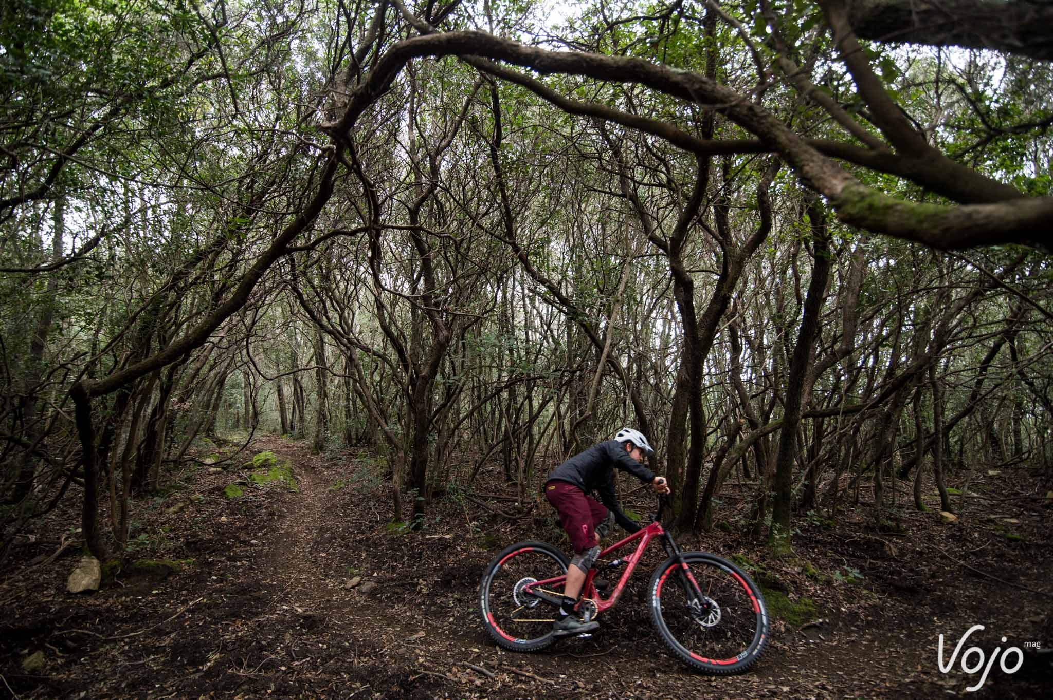 On sort à pleine vitesse des appuis, et on se sent vraiment pousser des ailes. Avec la « grosse » fourche de 150mm de débattement, on charge l’avant du vélo, qui encaisse, la suspension arrière s’enfonce, reste toutefois progressive, et arrive à suivre le rythme. On se lance sans trop d’arrière-pensée sur la piste de descente des hauteurs de Punta Ala et on s’en sort sans une égratignure. On a toujours l’impression d’avoir du débattement en réserve. Trois coups de pédale plus tard, les accélérations sont franches et on est de retour en haut de la bosse pour recommencer. Les capacités de cet « all-mountain » sont simplement bluffantes et on comprend sans mal qu’une version proche de celle que nous avons entre les jambes soit utilisée par les pilotes de la marque sur les compétitions d’enduro.
