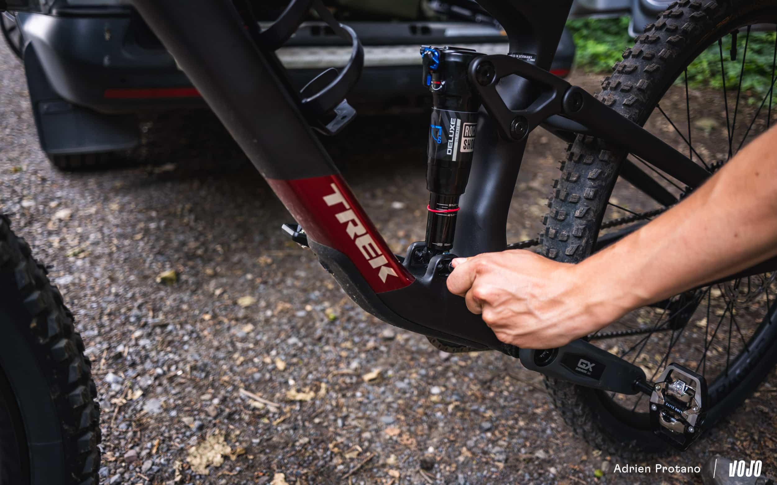 Côté réglages de suspensions, nous avons préféré le vélo avec un SAG de 27% à l’arrière (Trek recommande un SAG légèrement en dessous des 30%). Pour nos 63 kg, cela s’est apparenté à une pression de 140 psi, tandis que nous étions à 7 clics de rebond depuis la position fermée. Pour la fourche, nous sommes allé légèrement au-dessus des recommandations de l’application smartphone RockShox Trailhead, avec une pression de 61 psi et 12 clics de rebond depuis la position fermée.