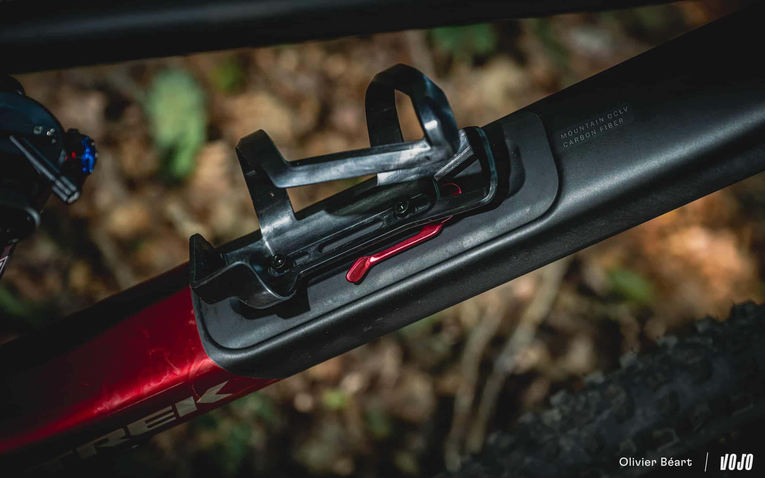 Trek a profité de l’occasion pour revoir la boîte à gant situé sur le tube diagonal, en la dotant d’une ouverture plus importante. La trappe en plastique de ce rangement a également été retravaillée afin d’être plus étanche. À l’intérieur, deux sacoches en néoprène sont fournies avec le vélo, l’une à destination des outils et l’autre pour transporter une chambre à air. Côté stockage, on notera également le support situé sous le tube supérieur.