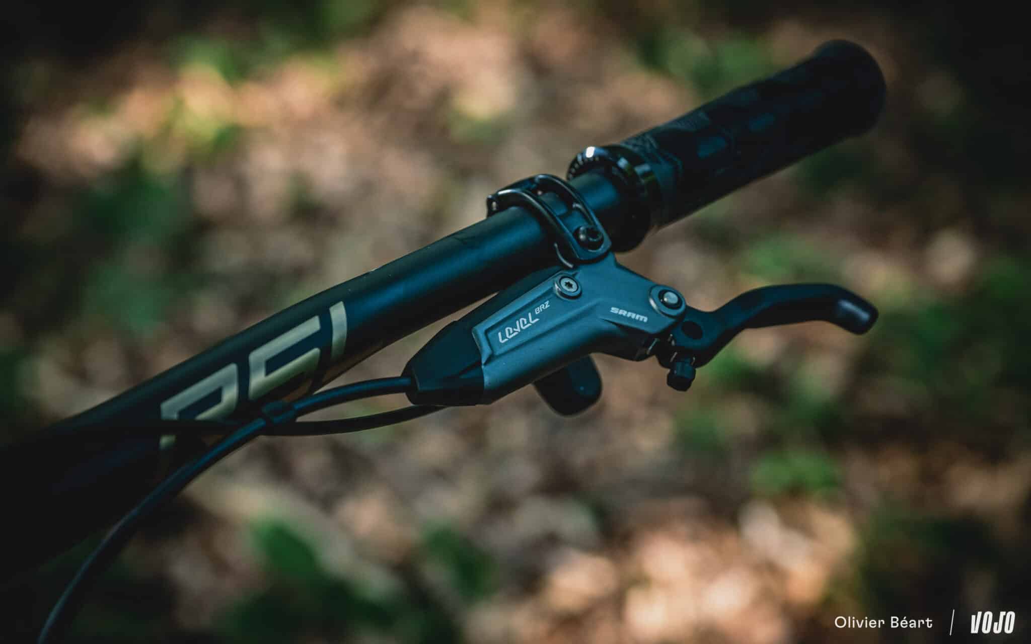 Sram est également bien présent de part et d’autre du vélo, avec un groupe AXS GX T-Type(cf. Test | Sram Eagle AXS 2023 : sans égal – plateau de 30 dents, manivelles en 170 mm) ainsi qu’une paire de freins Level Bronze à 4 pistons et disques de 180 mm.