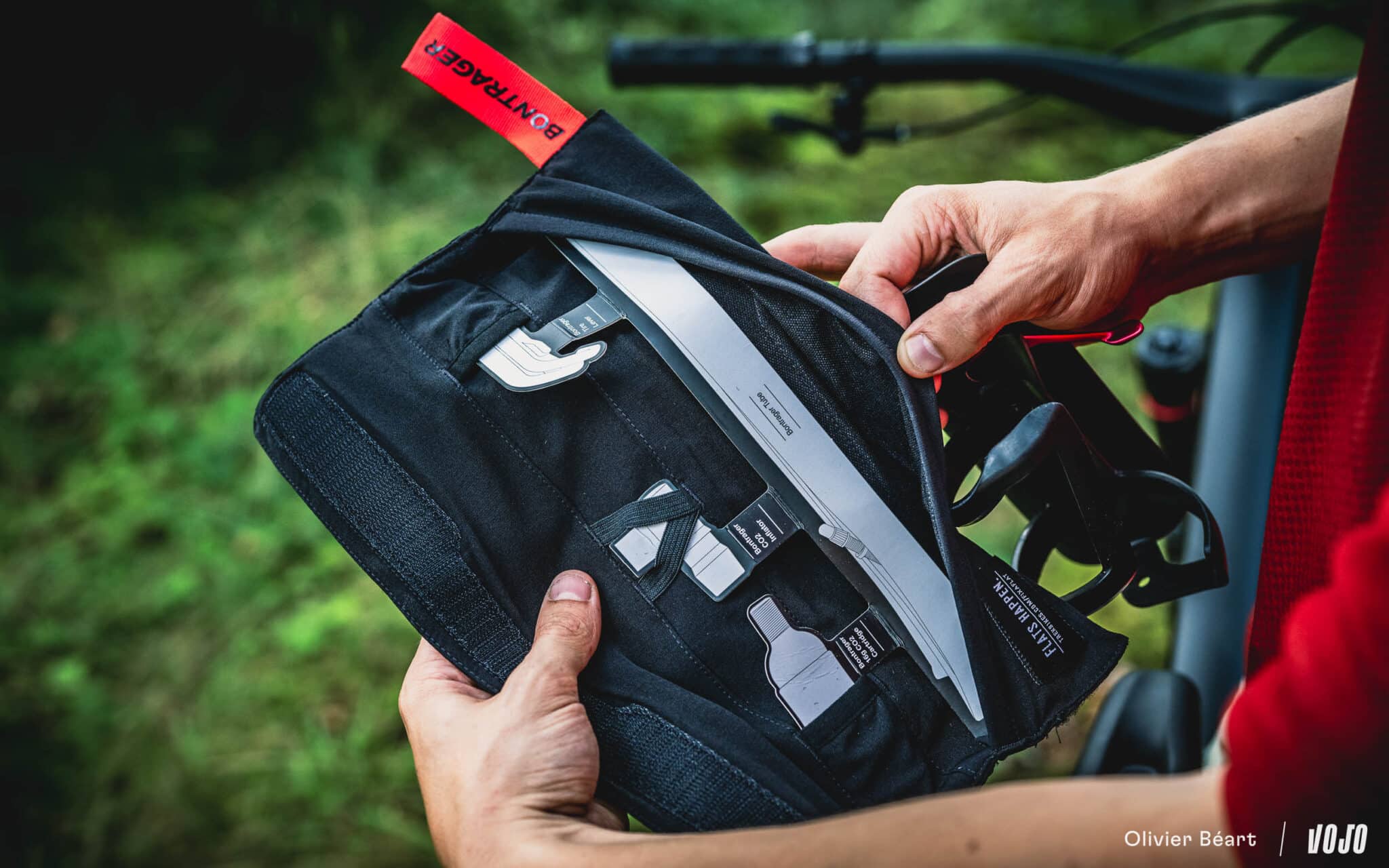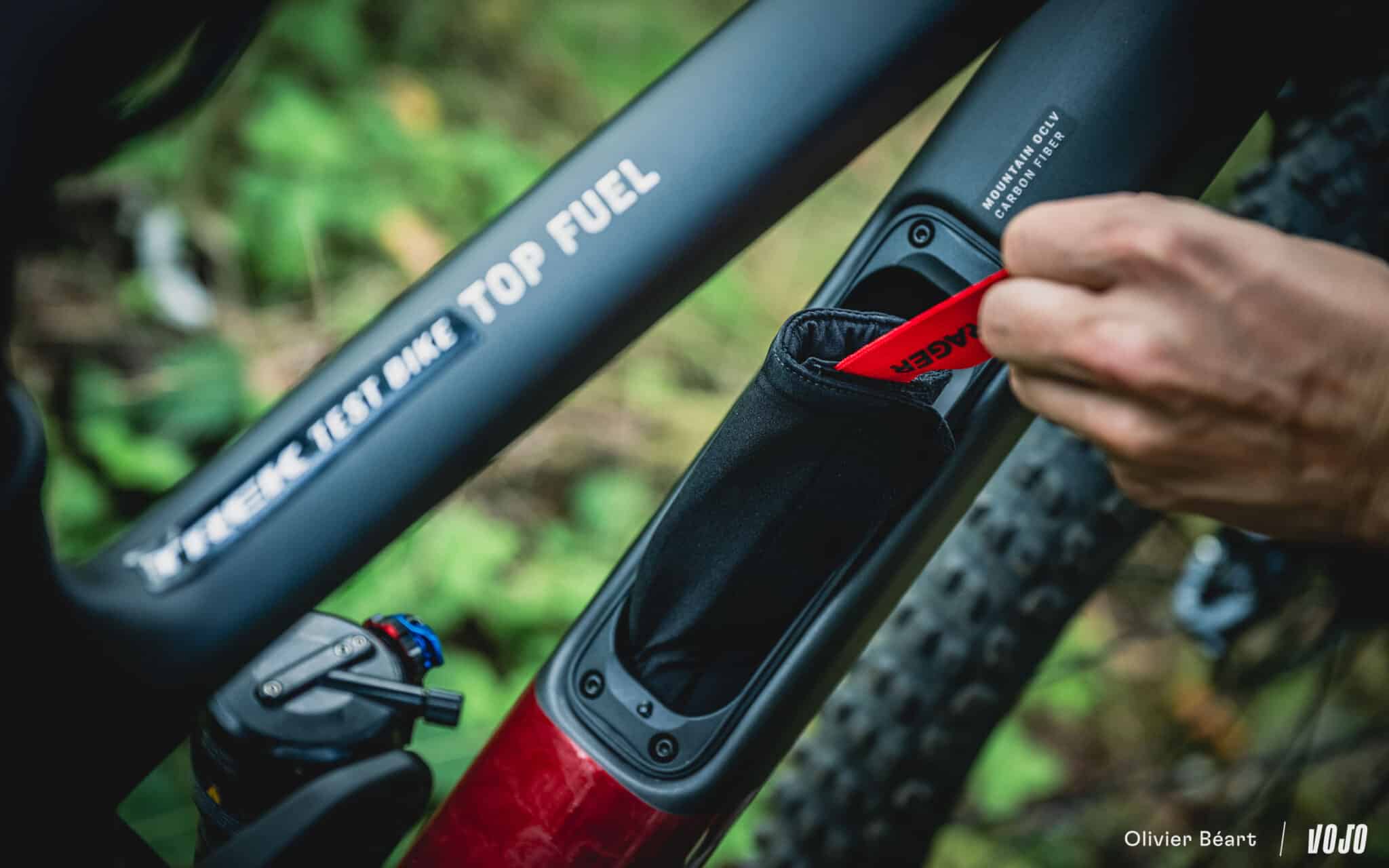 Trek a profité de l’occasion pour revoir la boîte à gant situé sur le tube diagonal, en la dotant d’une ouverture plus importante. La trappe en plastique de ce rangement a également été retravaillée afin d’être plus étanche. À l’intérieur, deux sacoches en néoprène sont fournies avec le vélo, l’une à destination des outils et l’autre pour transporter une chambre à air. Côté stockage, on notera également le support situé sous le tube supérieur.