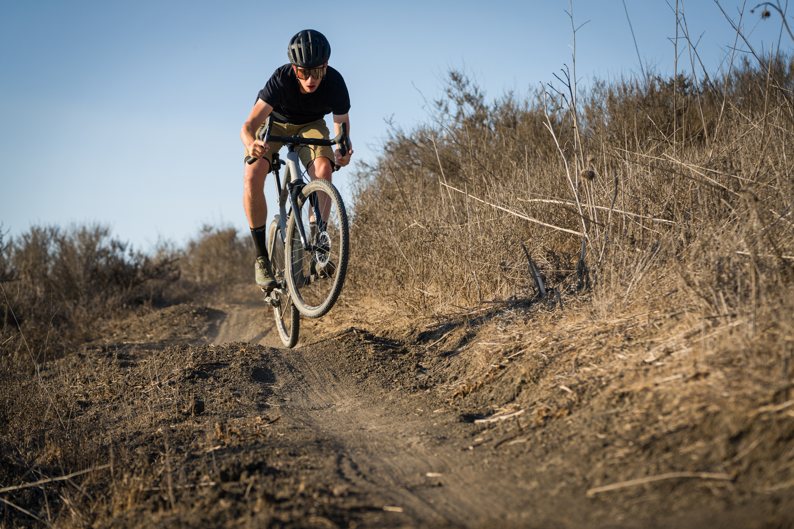 On enchaîne notre prise en main avec une traversée plus longue, en alternant entre quelques portions de route, de piste, de sentiers et même quelques petits sauts. Le cadre présente une bonne rigidité et un bon dynamisme. On ne peut pas en dire autant des roues WTB qui trainent un peu la patte. Montées de gros pneus en 42 (pression : 2.0/2.4 bars), on apprécie le grip et la stabilité dans les descentes, mais sur le plat, nous n’avons pas affaire au couteau le plus aiguisé du tiroir.