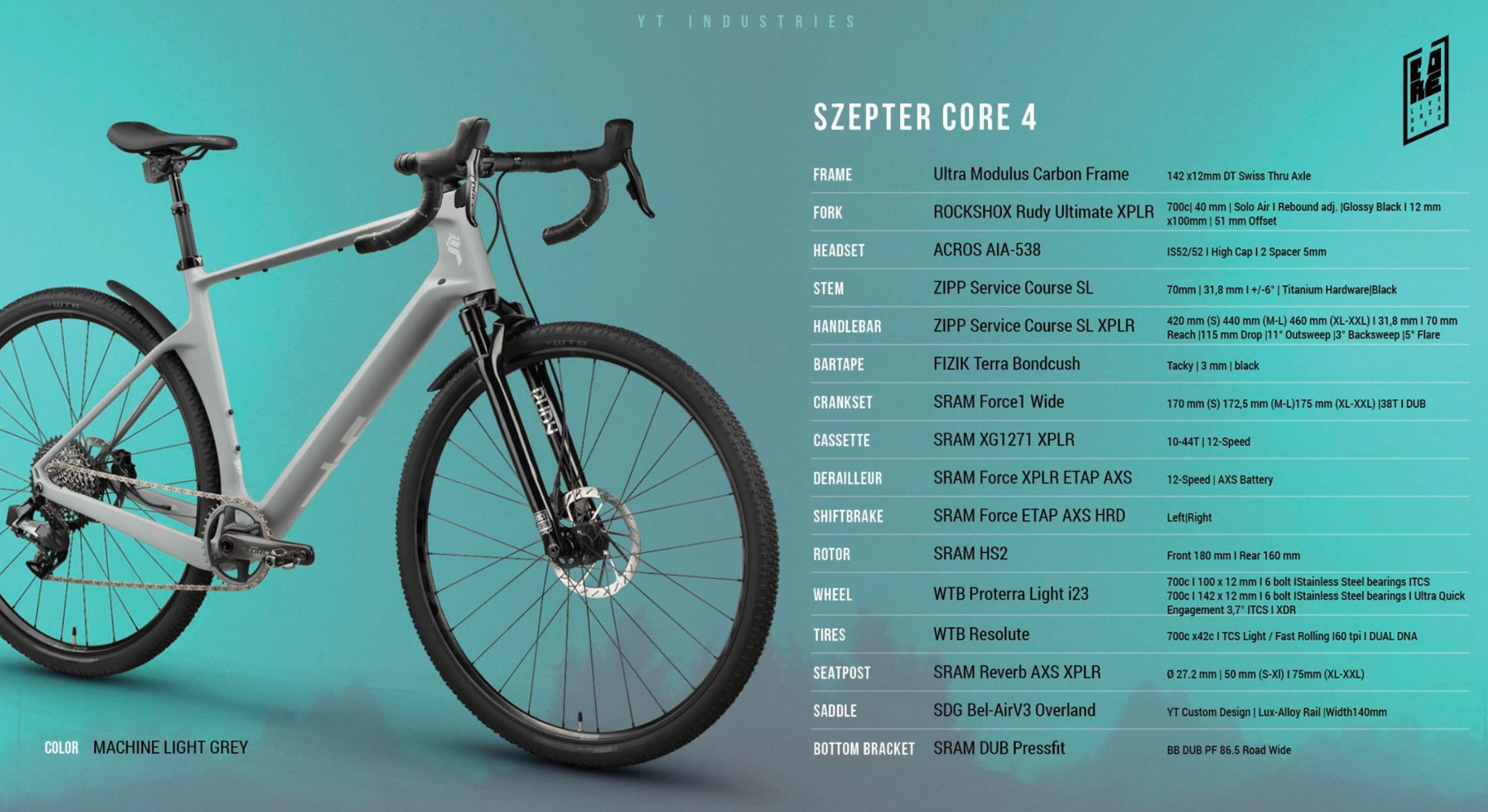 La gamme des Szepter est assez simple. On retrouve deux modèles, tous les deux en carbone. Le modèle Core 4, le plus haut de gamme, est proposé à 4499€ et s’équipe de tout le groupe Sram XPLR : la fourche Rudy Ultimate évidemment, la tige de selle Reverb AXS XPLR, des freins, commandes et dérailleur Force XPLR Etap AXS, complétés par un poste de pilotage Zipp Service Course. Côté train roulant, on retrouve un combo WTB Proterra Light i23 pour les roues et des pneus Resolute de la même marque. Sur la balance, il est annoncé à 9,9kg (en taille S, sans pédales).