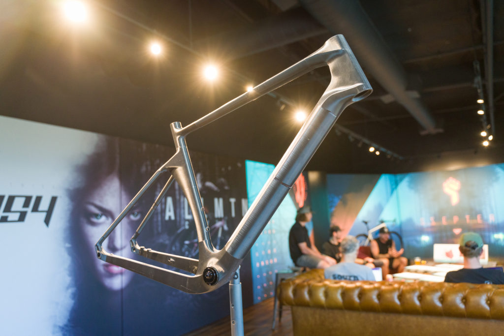 Du côté de la construction du cadre, le YT Szepter ne sera proposé qu’en carbone à un poids annoncé de 1,4kg en taille L. La marque a divisé la construction de son cadre en trois sections distinctes que nous présentent Ray, directeur des produits chez YT, et Martin, responsable du design. Les deux travaillent main dans la main pour proposer un vélo qui propose de bonnes solutions techniques, tout en reprenant les codes esthétiques de la marque.