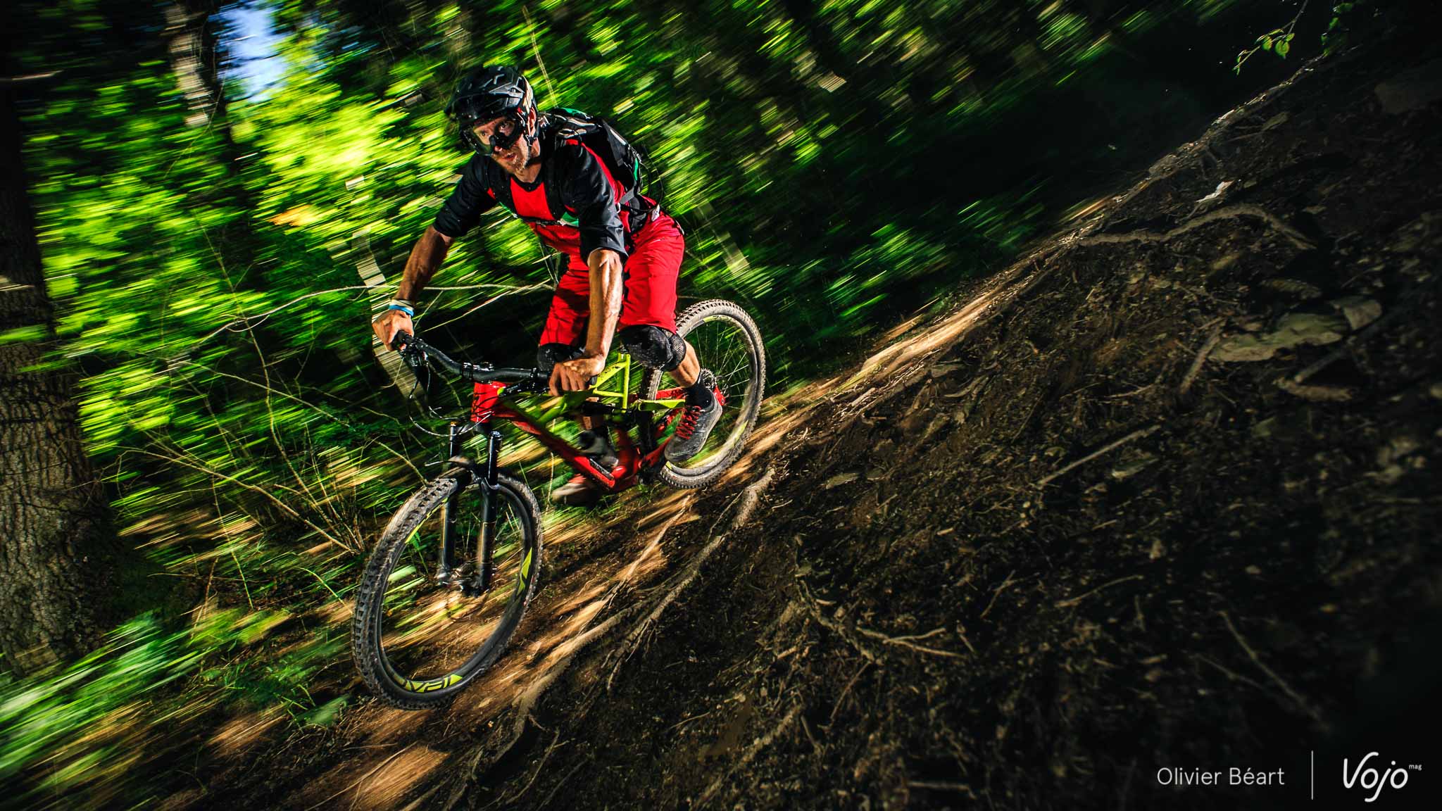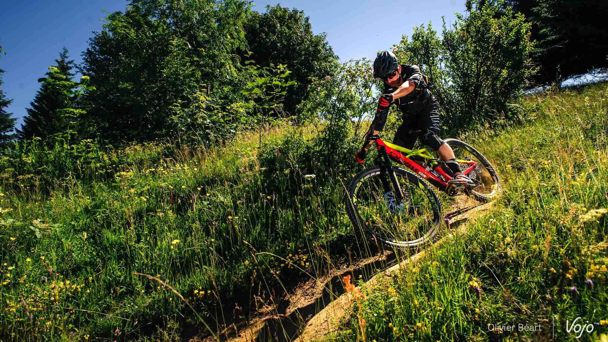 Allez, hop, nous voilà au sommet ! On entame les hostilités par du rapide sur une crête avec de bonnes ornières et quelques virages un peu secs. D’emblée, le travail des suspensions impressionne. Quelle onctuosité ! Et quel maintien aussi ! Jamais on n’a l’impression d’utiliser un millimètre de débattement en trop : ça s’enfonce juste ce qu’il faut, sans aucune plongée et en conservant magistralement l’assiette du vélo. Par contre, tant qu’il n’y a pas de vraie pente et si on ne roule pas vraiment vite, il faut savoir le brusquer pour tourner ou le faire sortir d’une ornière en bunny-up. Novice, passe ton chemin, y a rien à voir !