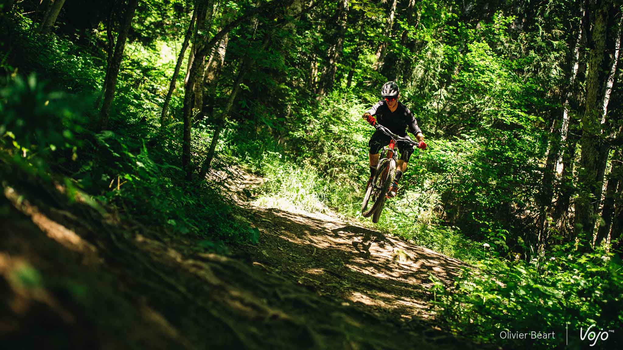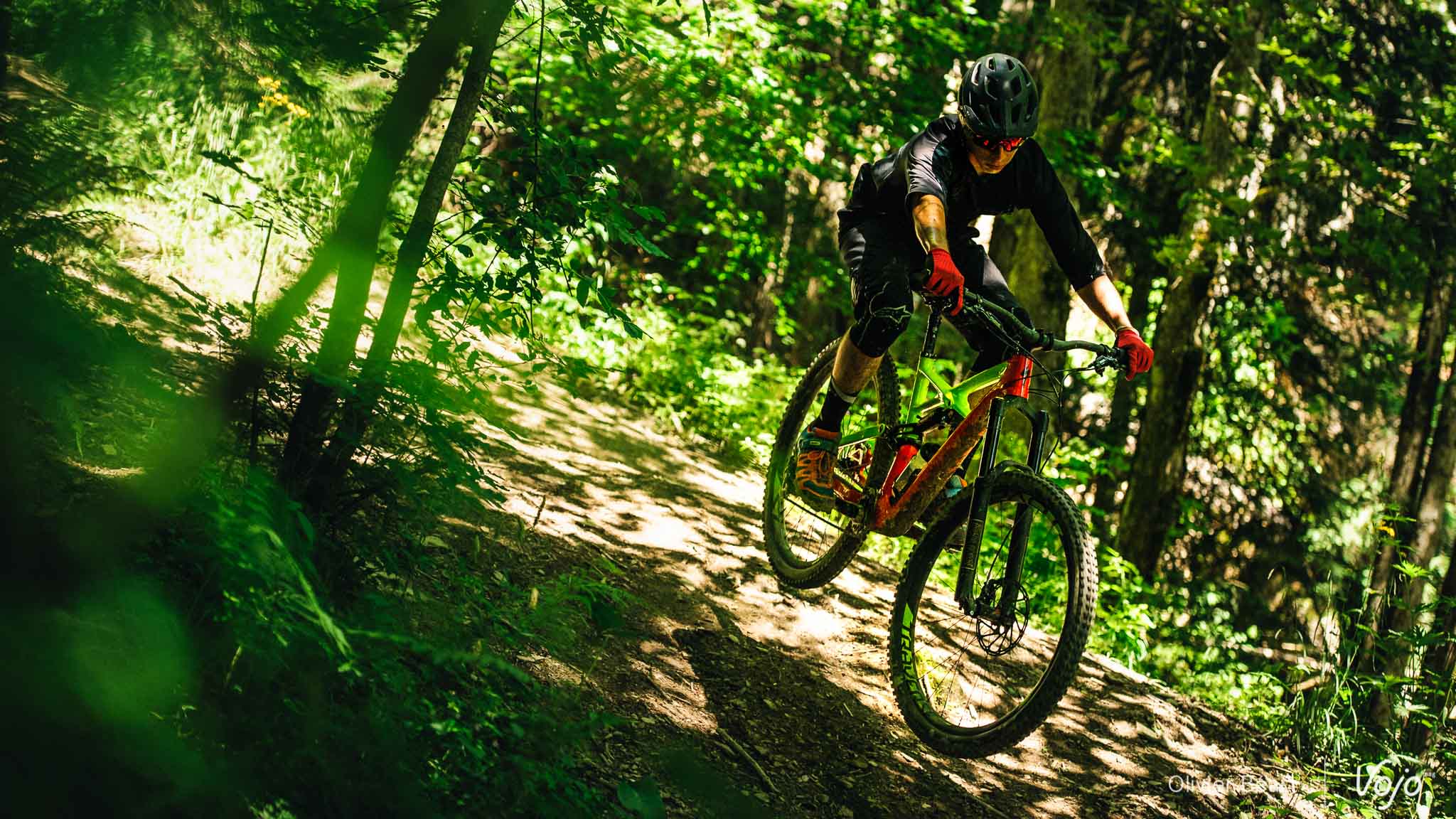 Dans les sous-bois typiques des Gets, où le sol est rempli de racines, la machine est impériale. On sent bien le relief, mais on place la roue sans trop réfléchir et ça tient. On peut dire merci aux excellents pneus Specialized (Butcher 29×2.3 avant/arrière sur notre vélo de test), mais aussi aux roues qui ne sont pas trop raides même si elles sont en carbone, ainsi qu’au cadre dont on peut dire exactement la même chose. Oui, le boîtier et la douille de direction son bien verrouillés, permettant de garantir la précision de l’ensemble et sa vivacité sous les grosses contraintes, mais on ne vire pas dans le bout de bois limite inexploitable. Sa capacité à filtrer les vibrations et à se déformer légèrement dans les appuis est immédiatement perceptible et c’est tant mieux !