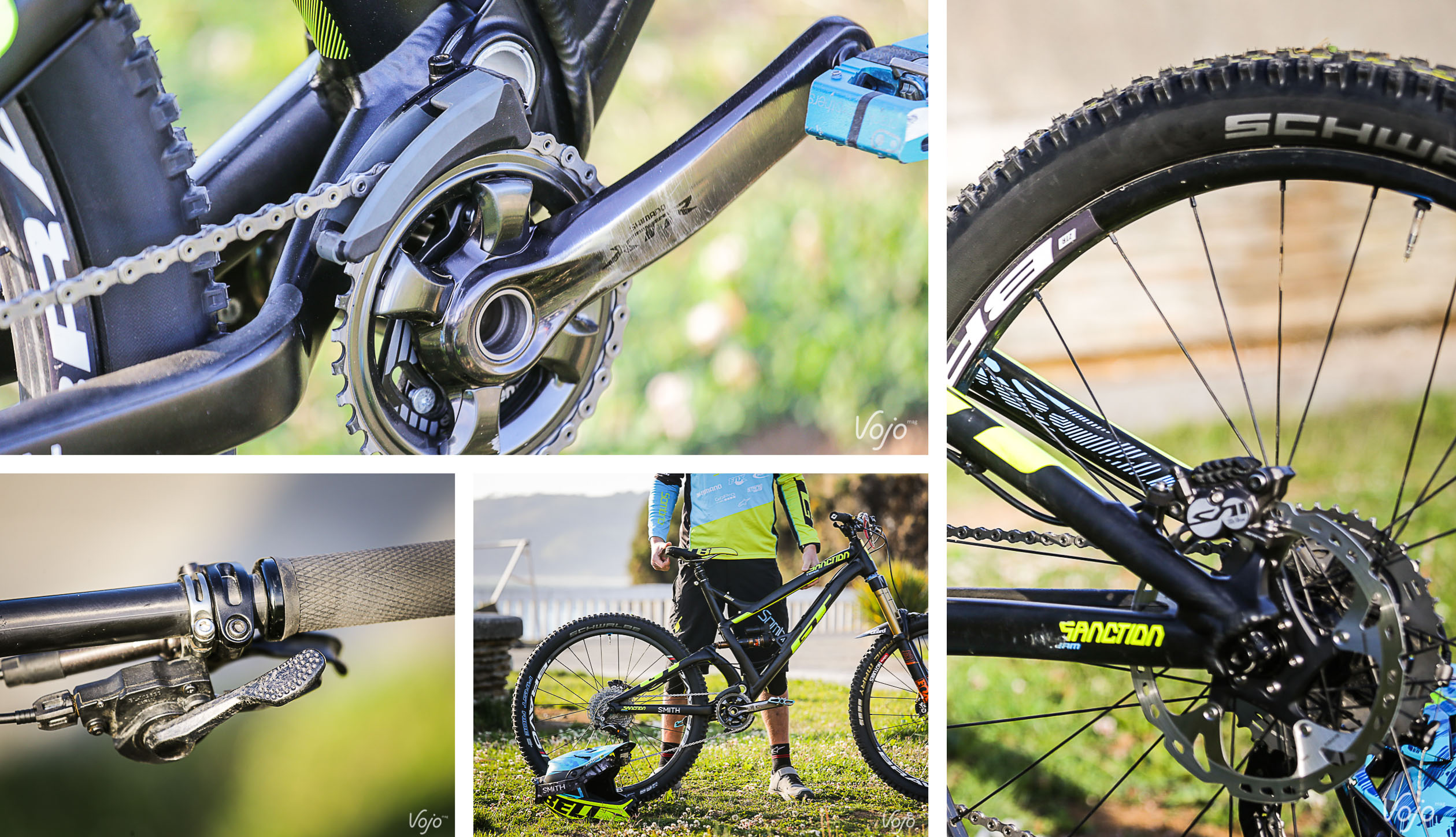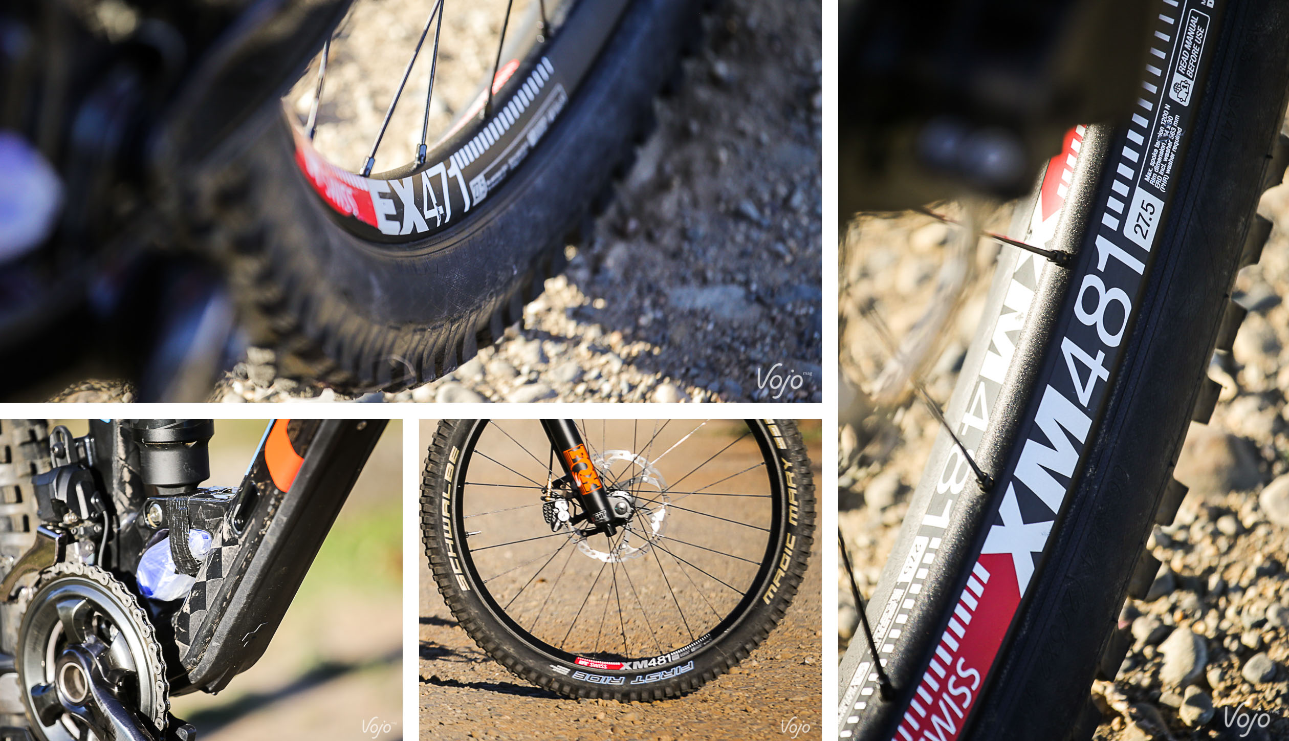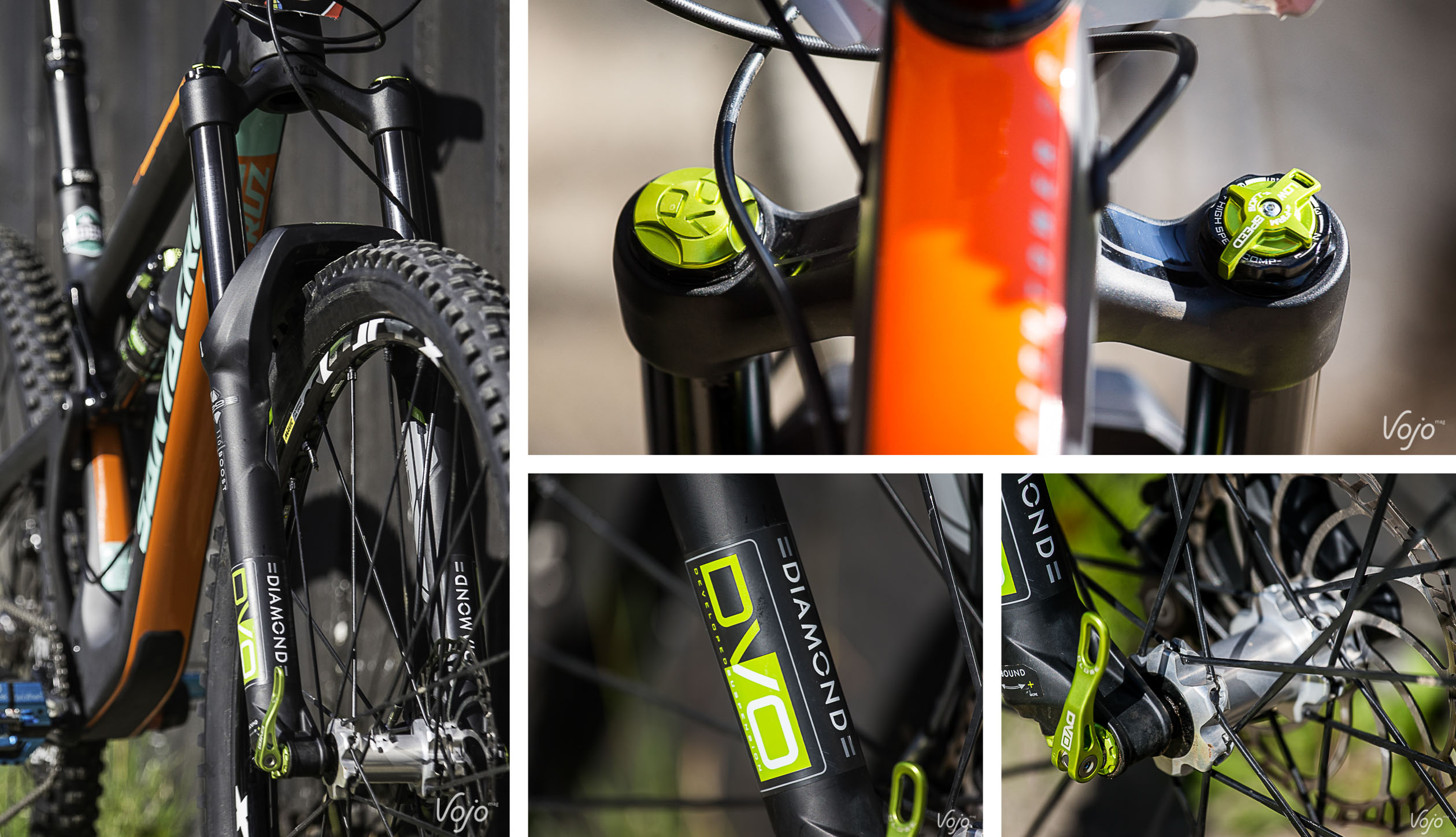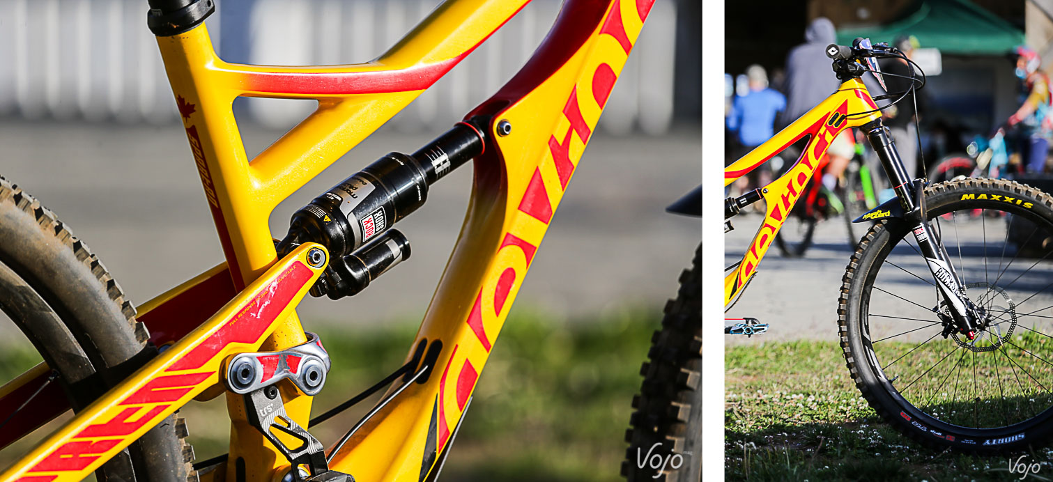 Le cadre offre 135mm de débattement (avec amortisseur DVO) et la fourche DVO Diamond Boost est en 150mm. Le cadre et la fourche sont équipés de moyeux Mavic prototypes adaptés au format Boost et montés sur des jantes CrossMax XL. Les pneus proviennent de chez Panaracer.