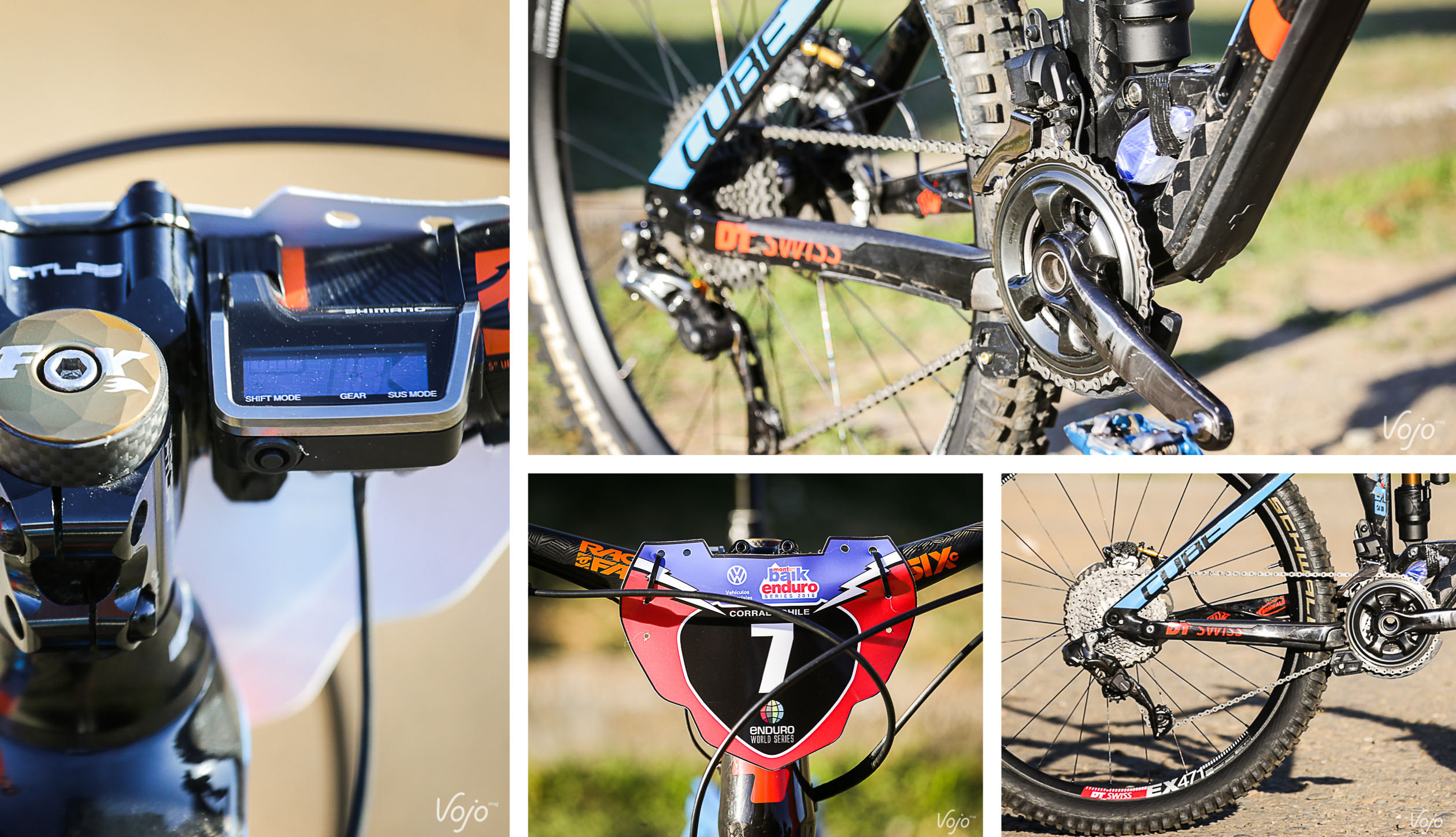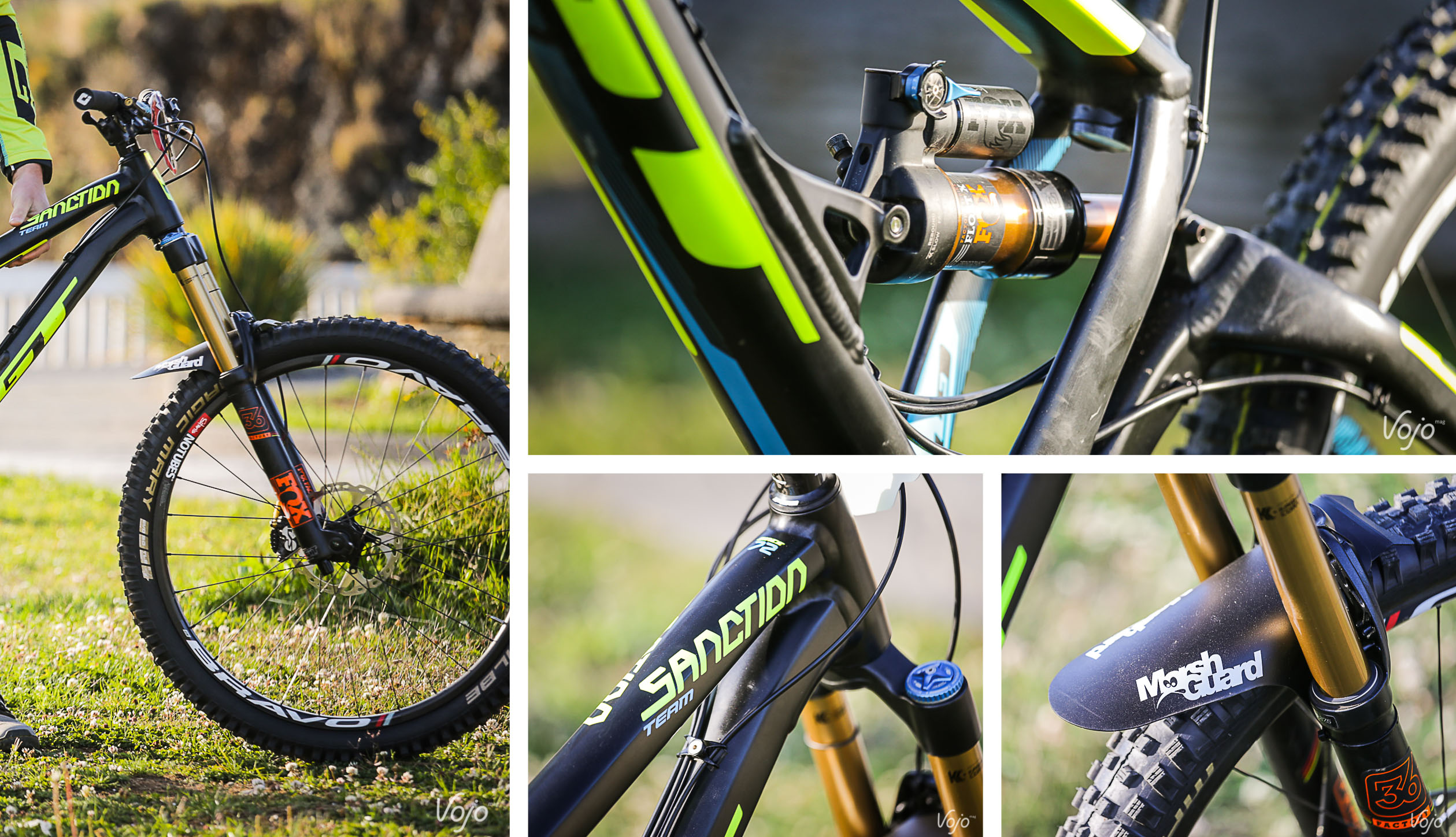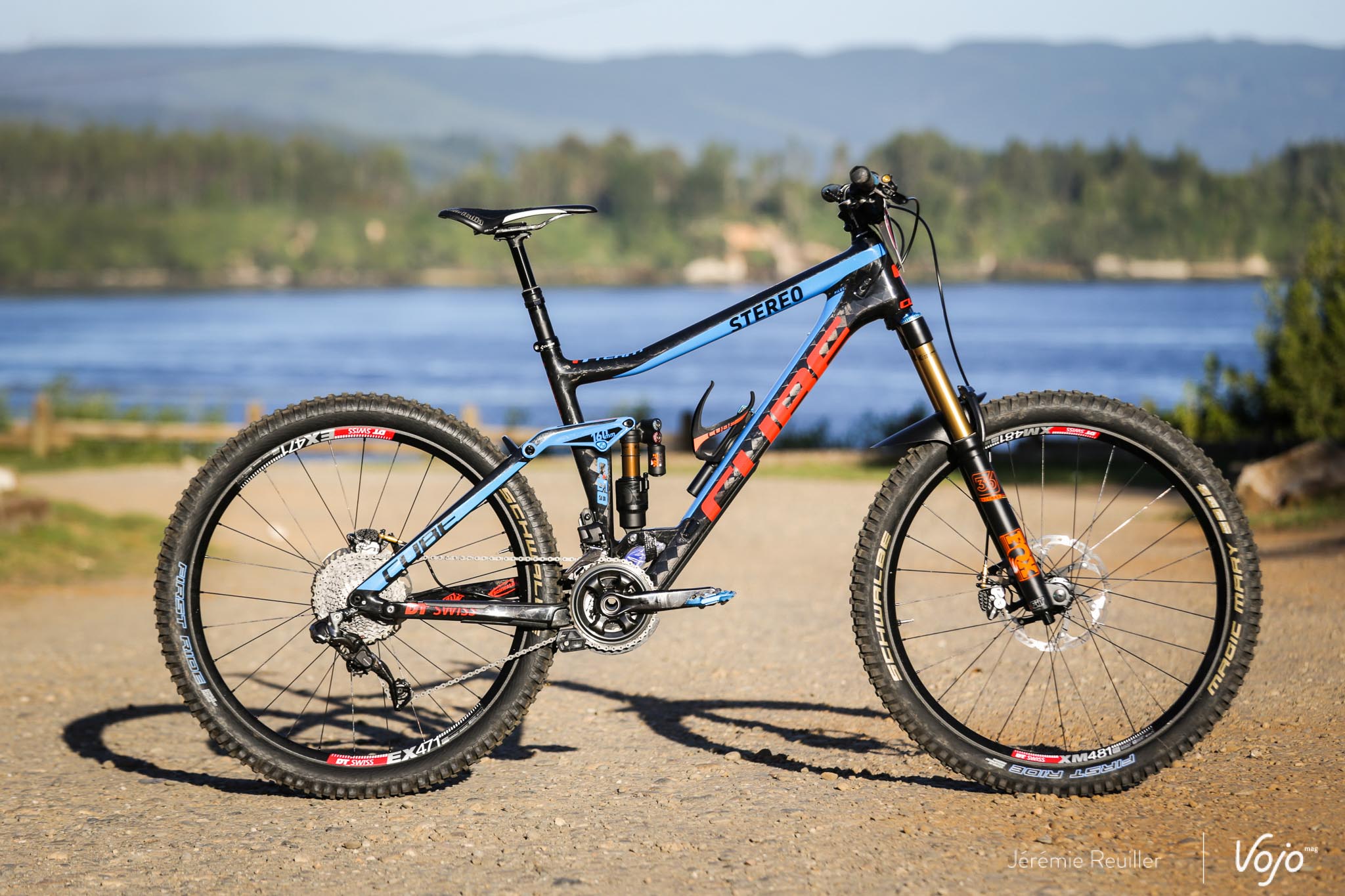Le cadre offre 135mm de débattement (avec amortisseur DVO) et la fourche DVO Diamond Boost est en 150mm. Le cadre et la fourche sont équipés de moyeux Mavic prototypes adaptés au format Boost et montés sur des jantes CrossMax XL. Les pneus proviennent de chez Panaracer.