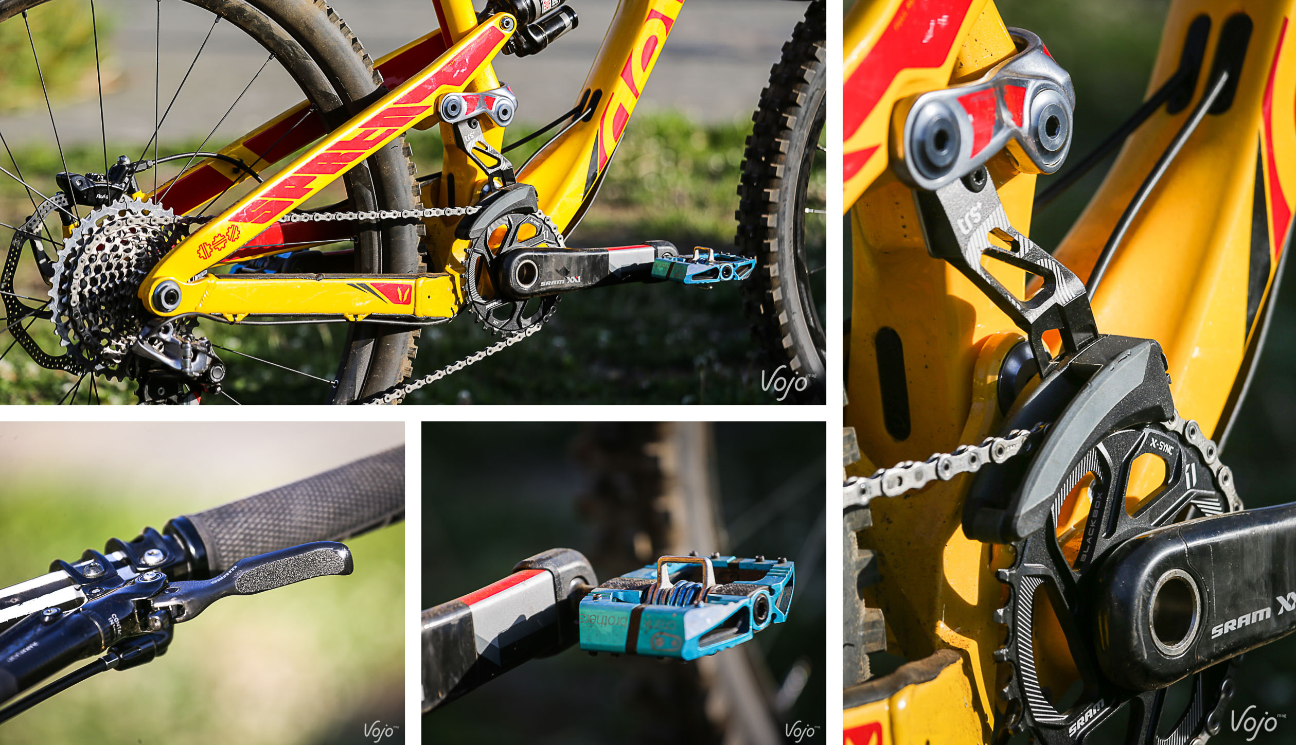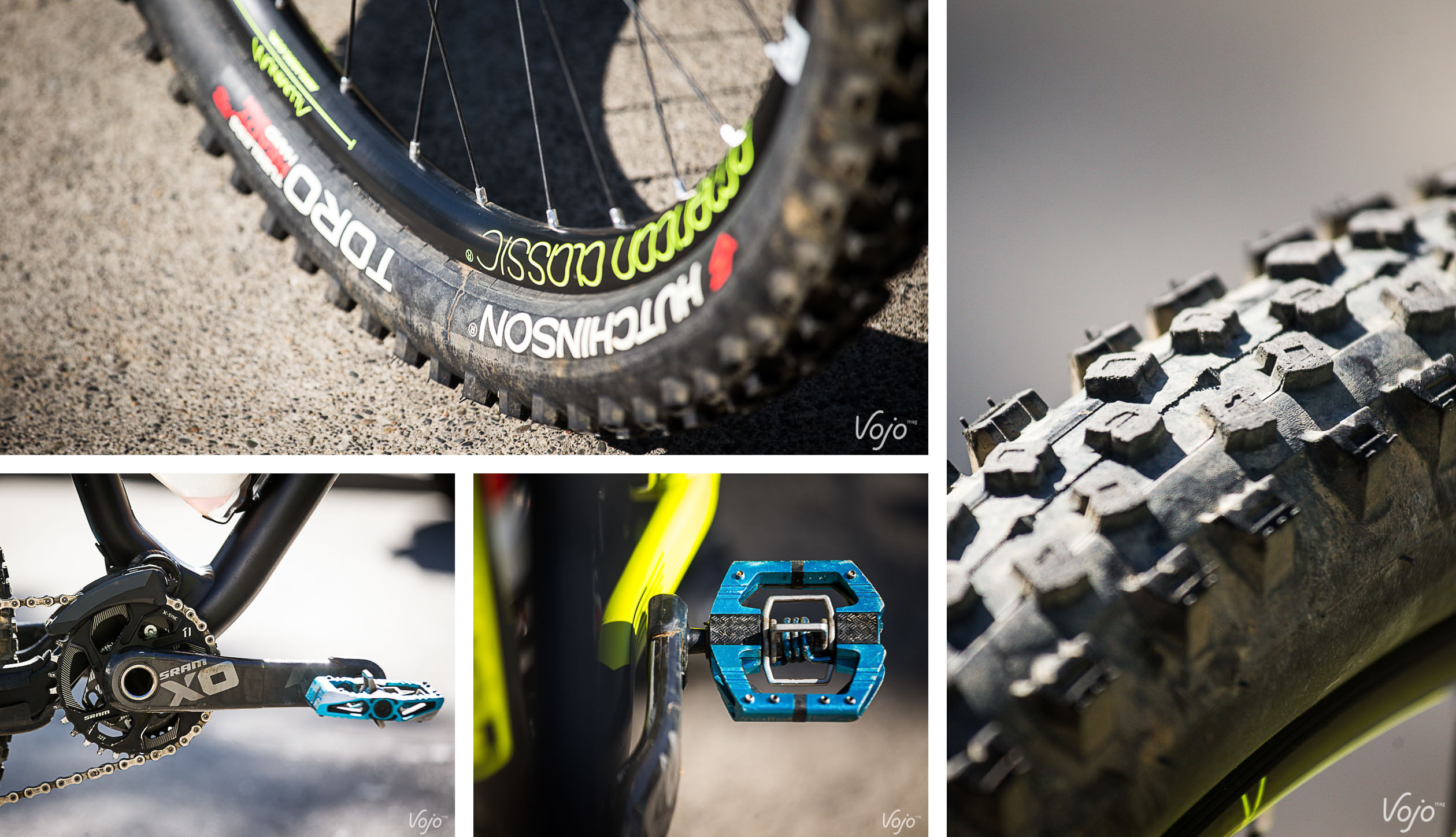 Les roues sont des American Classic All Mountain chaussées de pneus Hutchinson Toro en 2.25 derrière et 2.35 devant. La transmission est en 100% Sram XX1/XO1 et les freins des Guide Ultimate. GCintre, potence et tige de selle proviennent de chez KS et les pédales sont encore une fois les fameuses Crank Brothers Mallet Enduro.
