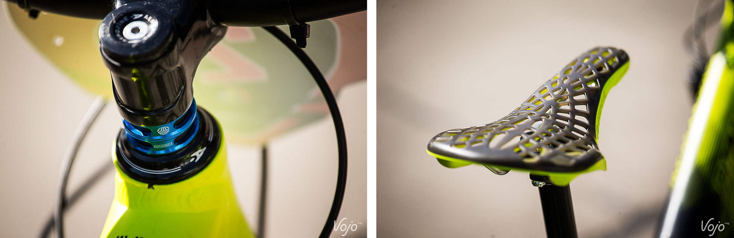 On note que Cécile apprécie les pièces perforées, avec notamment la selle Tioga Spider ou encore les petites entretoises SB3 alu ajourées.