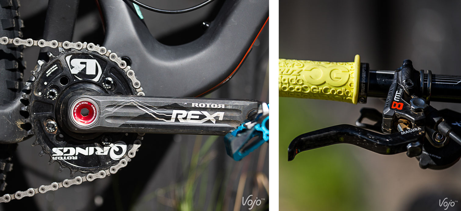 Parmi les nouveaux partenaires de CG, on note Magura pour les freins (MT8 double pistons, plutôt typés XC mais très puissants comme nous avions pu le voir lors de notre test) et Rotor pour le pédalier et le fameux plateau ovale en 32 dents. Le reste de la transmission est en Shimano XTR Mécanique.