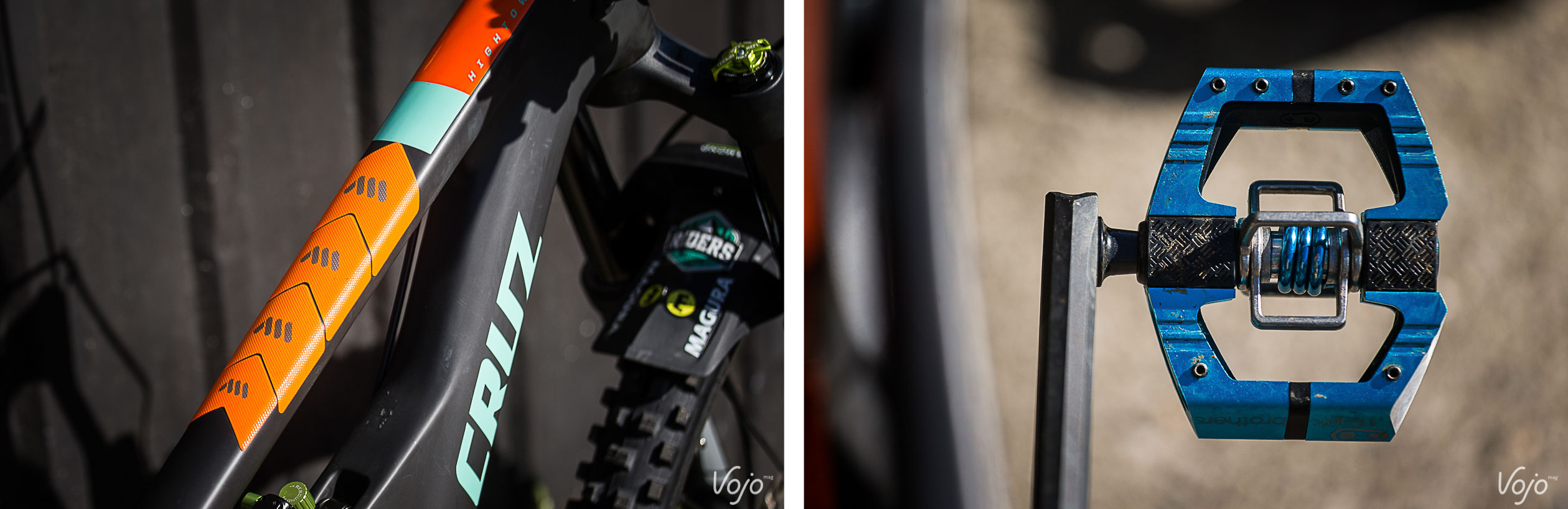 Derniers détails : CG roule avec des protections AMStyle sur son cadre et une nouvelle tige télescopique Crank Brothers va bientôt remplacer sa Reverb. CG est lié à la marque pour les pédales également et roule pour la fondation #CB4Others qui permet de récolter des fonds pour aider à réaliser les rêves d’enfants malades.