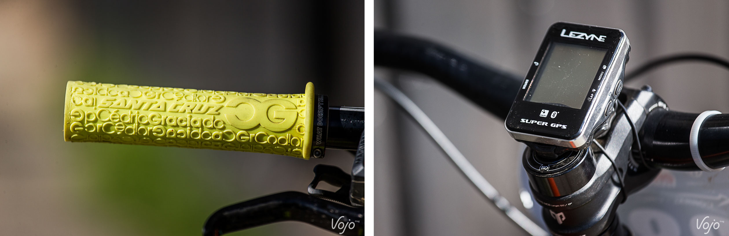 Toujours à la pointe niveau pièces personnalisées, CG roule avec un poste de pilotage Production Privée et des grips Santa Cruz à son nom, « comme ça si tu me piques mon vélo et que tu essaies de me faire croire que c’est le tien, je sais direct que ce n’est pas vrai et t’es mort », précise CG… et on vous laisse imaginer l’accent et la façon dont il le dit, ça vaut de l’or. « J’ai aussi un super GPS Lezyne pour ne pas me perdre et je vois même les calories que je perds sur la journée. Quand tu fais 90kg comme moi, c’est super important ! »