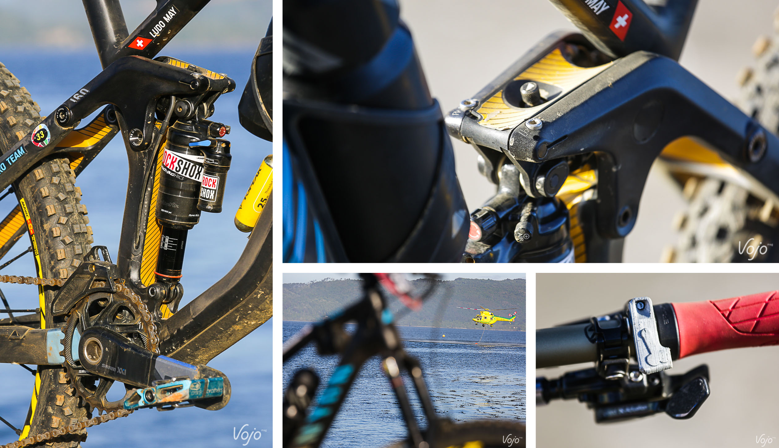 « Le cadre n’a pas changé, explique Damien, et l’amortisseur non plus. Pour la fourche par contre, je suis avec la nouvelle Lyrik en 170mm de débattement. Je garde les mêmes settings toute l’année derrière et aussi au niveau de la fourche, sauf que j’ai une cartouche perso qui me permet de faire quelques ajustements précis avec des clics spécifiques pour faire des changements juste avant les spéciales selon leur profil au niveau de la compression en basses vitesses. »