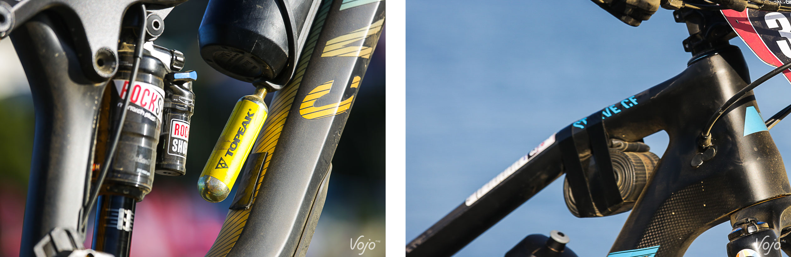 « J’essaie aussi de rouler sans sac pour que rien ne gène mes mouvements. Je place donc tout ce qu’il faut pour réparer sur le vélo : j’ai un câble de dérailleur sous la selle, une chambre à air collée sur le vélo, la cartouche de CO2 Topeak vissée sur le porte-bidon adapté (avec une petite protection pour ne pas que ça tape sur le cadre) et, bien évidemment un bidon. »